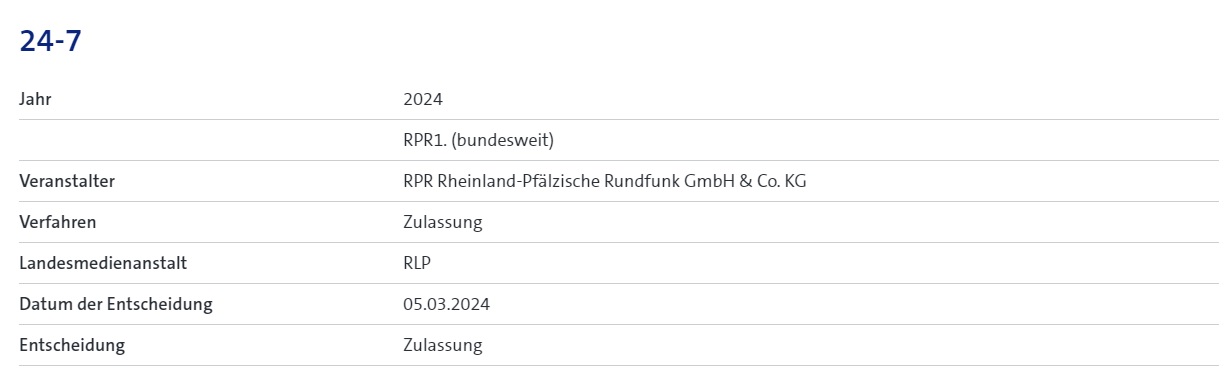 2024, RPR1. (bundesweit), RPR Rheinland-Pfälzische Rundfunk GmbH & Co. KG, Zulassung, RLP, 05.03.2024, Zulassung.