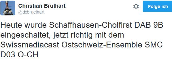 Laut Twitter-Meldung wurde heute im Swissmediacast-Regionalensemble Ostschweiz auf Kanal 9B der Standort Schaffhausen-Cholfirst eingeschaltet.