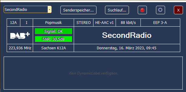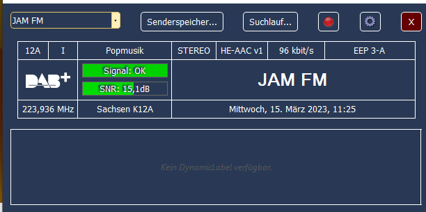 Ensemble 0x1139, Label: 'Sachsen K12A', ShortLabel: 'Sn K12A', LTO: +60 min, ECC: 0xE0, AlarmFlag: 0, NumServices: 7 Audio-Service 0x10B2, Label: 'JAM FM', ShortLabel: 'JAM FM', PTY: Pop Music (dynamic), AnnouncementSupport: No, NumComponents: 1 (Audio: 1, Data: 0) AudioComponent, SCIdS: 0, Label: '', ShortLabel: '', ASCTy: 0x3F (AAC), SubChId: 10, StartCU: 324, NumCU: 72, ErrorProt: EEP 3-A (FEC: 1/2), Datarate: 96 kbit/s, NumUserApps: 1 User App 1 / 1, Label: '', ShortLabel: '', DSCTy: 0x3C (MOT), X-PAD type: 12, UaType: 0x2 (Slideshow), DataLen: 2 [0C3C] Audio-Service 0x10C2, Label: 'SecondRadio', ShortLabel: 'SR', PTY: Pop Music (dynamic), AnnouncementSupport: No, NumComponents: 1 (Audio: 1, Data: 0) AudioComponent, SCIdS: 0, Label: '', ShortLabel: '', ASCTy: 0x3F (AAC), SubChId: 8, StartCU: 192, NumCU: 66, ErrorProt: EEP 3-A (FEC: 1/2), Datarate: 88 kbit/s, NumUserApps: 1 User App 1 / 1, Label: '', ShortLabel: '', DSCTy: 0x3C (MOT), X-PAD type: 12, UaType: 0x2 (Slideshow), DataLen: 2 [0C3C] Audio-Service 0x12C9, Label: 'FEMOTION', ShortLabel: 'FEMOTION', PTY: Pop Music (dynamic), AnnouncementSupport: No, NumComponents: 1 (Audio: 1, Data: 0) AudioComponent, SCIdS: 0, Label: '', ShortLabel: '', ASCTy: 0x3F (AAC), SubChId: 11, StartCU: 396, NumCU: 60, ErrorProt: EEP 3-A (FEC: 1/2), Datarate: 80 kbit/s, NumUserApps: 1 User App 1 / 1, Label: '', ShortLabel: '', DSCTy: 0x3C (MOT), X-PAD type: 12, UaType: 0x2 (Slideshow), DataLen: 2 [0C3C] Audio-Service 0x1735, Label: 'Schlager Radio', ShortLabel: 'Schlager', PTY: Pop Music (dynamic), AnnouncementSupport: No, NumComponents: 1 (Audio: 1, Data: 0) AudioComponent, SCIdS: 0, Label: '', ShortLabel: '', ASCTy: 0x3F (AAC), SubChId: 5, StartCU: 72, NumCU: 60, ErrorProt: EEP 3-A (FEC: 1/2), Datarate: 80 kbit/s, NumUserApps: 1 User App 1 / 1, Label: '', ShortLabel: '', DSCTy: 0x3C (MOT), X-PAD type: 12, UaType: 0x2 (Slideshow), DataLen: 2 [0C3C] Audio-Service 0x1B2E, Label: 'RADIO TEDDY', ShortLabel: 'TEDDY', PTY: Children's programmes (dynamic), AnnouncementSupport: No, NumComponents: 1 (Audio: 1, Data: 0) AudioComponent, SCIdS: 0, Label: '', ShortLabel: '', ASCTy: 0x3F (AAC), SubChId: 6, StartCU: 132, NumCU: 60, ErrorProt: EEP 3-A (FEC: 1/2), Datarate: 80 kbit/s, NumUserApps: 1 User App 1 / 1, Label: '', ShortLabel: '', DSCTy: 0x3C (MOT), X-PAD type: 12, UaType: 0x2 (Slideshow), DataLen: 2 [0C3C] Audio-Service 0x1EC1, Label: 'RADIO OSTROCK', ShortLabel: 'OSTROCK', PTY: Pop Music (dynamic), AnnouncementSupport: No, NumComponents: 1 (Audio: 1, Data: 0) AudioComponent, SCIdS: 0, Label: '', ShortLabel: '', ASCTy: 0x3F (AAC), SubChId: 9, StartCU: 258, NumCU: 66, ErrorProt: EEP 3-A (FEC: 1/2), Datarate: 88 kbit/s, NumUserApps: 1 User App 1 / 1, Label: '', ShortLabel: '', DSCTy: 0x3C (MOT), X-PAD type: 12, UaType: 0x2 (Slideshow), DataLen: 2 [0C3C] Audio-Service 0xD0DB, Label: '89.0 RTL', ShortLabel: '89.0 RTL', PTY: Pop Music (dynamic), AnnouncementSupport: No, NumComponents: 1 (Audio: 1, Data: 0) AudioComponent, SCIdS: 0, Label: '', ShortLabel: '', ASCTy: 0x3F (AAC), SubChId: 1, StartCU: 0, NumCU: 72, ErrorProt: EEP 3-A (FEC: 1/2), Datarate: 96 kbit/s, NumUserApps: 1 User App 1 / 1, Label: '', ShortLabel: '', DSCTy: 0x3C (MOT), X-PAD type: 12, UaType: 0x2 (Slideshow), DataLen: 2 [0C3C]