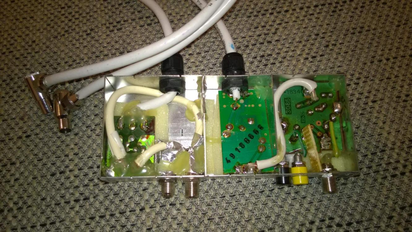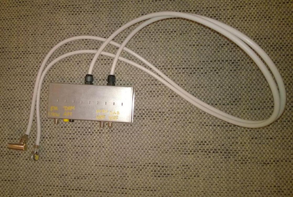 Zum Einsatz kommen eine VHF / UHF Weiche von Stolle für das Aufsplitten in DAB+ und DVBt, und eine Weiche von RFT des Typs 3086, weile das Radiosignal in UKW (75 Ohm) und AM (300 Ohm) aufsplittet. Dieser Weiche ist noch der sogenannte "AM-Connector" von Hirschmann vorgeschaltet der in den 80ern mal angeboten wurde, sodass das komplette Antennennetz des Hauses als Antenne dient.