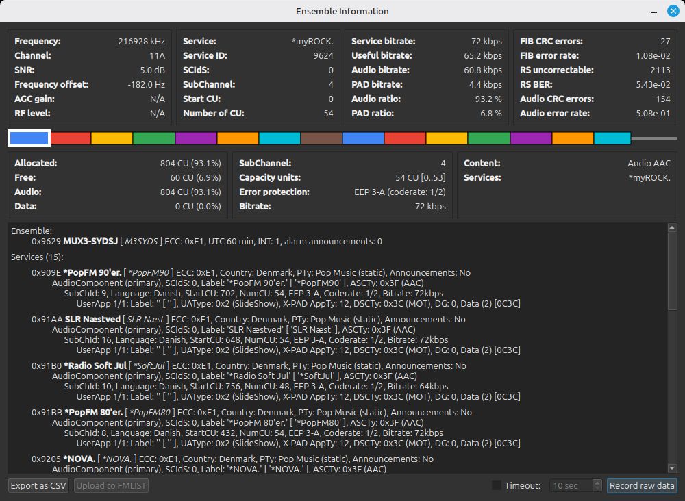 Ensemble: 0x9001 DK DAB1 [ DK DAB1 ] ECC: 0xE1, UTC 60 min, INT: 1, alarm announcements: 1 Services (18): 0x9091 BBC WorldService [ BBC WS ] ECC: 0xE1, Country: Denmark, PTy: News (static), Announcements: No AudioComponent (primary), SCIdS: 0, Label: 'BBC WorldService' [ 'BBC WS' ], ASCTy: 0x3F (AAC) SubChId: 1, Language: English, StartCU: 0, NumCU: 30, EEP 3-A, Coderate: 1/2, Bitrate: 40kbps UserApp 1/1: Label: '' [ '' ], UAType: 0x2 (SlideShow), X-PAD AppTy: 12, DSCTy: 0x3C (MOT), DG: 0, Data (2) [0C3C] 0x9092 r8Dio [ r8Dio ] ECC: 0xE1, Country: Denmark, PTy: Varied (static), Announcements: No AudioComponent (primary), SCIdS: 0, Label: 'r8Dio' [ 'r8Dio' ], ASCTy: 0x3F (AAC) SubChId: 2, Language: Danish, StartCU: 834, NumCU: 30, EEP 3-A, Coderate: 1/2, Bitrate: 40kbps UserApp 1/1: Label: '' [ '' ], UAType: 0x2 (SlideShow), X-PAD AppTy: 12, DSCTy: 0x3C (MOT), DG: 0, Data (2) [0C3C] 0x9094 *The Voice [ *Voice ] ECC: 0xE1, Country: Denmark, PTy: Pop Music (static), Announcements: No AudioComponent (primary), SCIdS: 0, Label: '*The Voice' [ '*Voice' ], ASCTy: 0x3F (AAC) SubChId: 4, Language: Danish, StartCU: 30, NumCU: 54, EEP 3-A, Coderate: 1/2, Bitrate: 72kbps UserApp 1/1: Label: '' [ '' ], UAType: 0x2 (SlideShow), X-PAD AppTy: 12, DSCTy: 0x3C (MOT), DG: 0, Data (2) [0C3C] 0x9095 *myROCK [ *myROCK ] ECC: 0xE1, Country: Denmark, PTy: Rock Music (static), Announcements: No AudioComponent (primary), SCIdS: 0, Label: '*myROCK' [ '*myROCK' ], ASCTy: 0x3F (AAC) SubChId: 5, Language: Danish, StartCU: 84, NumCU: 54, EEP 3-A, Coderate: 1/2, Bitrate: 72kbps UserApp 1/1: Label: '' [ '' ], UAType: 0x2 (SlideShow), X-PAD AppTy: 12, DSCTy: 0x3C (MOT), DG: 0, Data (2) [0C3C] 0x9096 *NOVA [ *NOVA ] ECC: 0xE1, Country: Denmark, PTy: Pop Music (static), Announcements: No AudioComponent (primary), SCIdS: 0, Label: '*NOVA' [ '*NOVA' ], ASCTy: 0x3F (AAC) SubChId: 6, Language: Danish, StartCU: 138, NumCU: 54, EEP 3-A, Coderate: 1/2, Bitrate: 72kbps UserApp 1/1: Label: '' [ '' ], UAType: 0x2 (SlideShow), X-PAD AppTy: 12, DSCTy: 0x3C (MOT), DG: 0, Data (2) [0C3C] 0x9097 *Pop FM [ *Pop FM ] ECC: 0xE1, Country: Denmark, PTy: Pop Music (static), Announcements: No AudioComponent (primary), SCIdS: 0, Label: '*Pop FM' [ '*Pop FM' ], ASCTy: 0x3F (AAC) SubChId: 7, Language: Danish, StartCU: 192, NumCU: 54, EEP 3-A, Coderate: 1/2, Bitrate: 72kbps UserApp 1/1: Label: '' [ '' ], UAType: 0x2 (SlideShow), X-PAD AppTy: 12, DSCTy: 0x3C (MOT), DG: 0, Data (2) [0C3C] 0x9098 *Radio Soft [ *Soft ] ECC: 0xE1, Country: Denmark, PTy: Easy Listening Music (static), Announcements: No AudioComponent (primary), SCIdS: 0, Label: '*Radio Soft' [ '*Soft' ], ASCTy: 0x3F (AAC) SubChId: 8, Language: Danish, StartCU: 246, NumCU: 54, EEP 3-A, Coderate: 1/2, Bitrate: 72kbps UserApp 1/1: Label: '' [ '' ], UAType: 0x2 (SlideShow), X-PAD AppTy: 12, DSCTy: 0x3C (MOT), DG: 0, Data (2) [0C3C] 0x9099 *Radio 100 [ *R100 ] ECC: 0xE1, Country: Denmark, PTy: Pop Music (static), Announcements: No AudioComponent (primary), SCIdS: 0, Label: '*Radio 100' [ '*R100' ], ASCTy: 0x3F (AAC) SubChId: 9, Language: Danish, StartCU: 300, NumCU: 54, EEP 3-A, Coderate: 1/2, Bitrate: 72kbps UserApp 1/1: Label: '' [ '' ], UAType: 0x2 (SlideShow), X-PAD AppTy: 12, DSCTy: 0x3C (MOT), DG: 0, Data (2) [0C3C] 0x909B *mix 7 [ *mix 7 ] ECC: 0xE1, Country: Denmark, PTy: Pop Music (static), Announcements: No AudioComponent (primary), SCIdS: 0, Label: '*mix 7' [ '*mix 7' ], ASCTy: 0x3F (AAC) SubChId: 11, Language: Danish, StartCU: 354, NumCU: 48, EEP 3-A, Coderate: 1/2, Bitrate: 64kbps UserApp 1/1: Label: '' [ '' ], UAType: 0x2 (SlideShow), X-PAD AppTy: 12, DSCTy: 0x3C (MOT), DG: 0, Data (2) [0C3C] 0x909C *Radio Vinyl [ *Vinyl ] ECC: 0xE1, Country: Denmark, PTy: Oldies Music (static), Announcements: No AudioComponent (primary), SCIdS: 0, Label: '*Radio Vinyl' [ '*Vinyl' ], ASCTy: 0x3F (AAC) SubChId: 12, Language: Danish, StartCU: 402, NumCU: 48, EEP 3-A, Coderate: 1/2, Bitrate: 64kbps UserApp 1/1: Label: '' [ '' ], UAType: 0x2 (SlideShow), X-PAD AppTy: 12, DSCTy: 0x3C (MOT), DG: 0, Data (2) [0C3C] 0x909D *PopFM 80'er [ *PopFM80 ] ECC: 0xE1, Country: Denmark, PTy: Pop Music (static), Announcements: No AudioComponent (primary), SCIdS: 0, Label: '*PopFM 80'er' [ '*PopFM80' ], ASCTy: 0x3F (AAC) SubChId: 13, Language: Danish, StartCU: 450, NumCU: 48, EEP 3-A, Coderate: 1/2, Bitrate: 64kbps UserApp 1/1: Label: '' [ '' ], UAType: 0x2 (SlideShow), X-PAD AppTy: 12, DSCTy: 0x3C (MOT), DG: 0, Data (2) [0C3C] 0x909E *PopFM 90'er [ *PopFM90 ] ECC: 0xE1, Country: Denmark, PTy: Pop Music (static), Announcements: No AudioComponent (primary), SCIdS: 0, Label: '*PopFM 90'er' [ '*PopFM90' ], ASCTy: 0x3F (AAC) SubChId: 10, Language: Danish, StartCU: 498, NumCU: 48, EEP 3-A, Coderate: 1/2, Bitrate: 64kbps UserApp 1/1: Label: '' [ '' ], UAType: 0x2 (SlideShow), X-PAD AppTy: 12, DSCTy: 0x3C (MOT), DG: 0, Data (2) [0C3C] 0x90A0 _PodRadio [ PodRadio ] ECC: 0xE1, Country: Denmark, PTy: N/A, Announcements: No AudioComponent (primary), SCIdS: 0, Label: '_PodRadio' [ 'PodRadio' ], ASCTy: 0x3F (AAC) SubChId: 19, Language: Danish, StartCU: 756, NumCU: 30, EEP 3-A, Coderate: 1/2, Bitrate: 40kbps UserApp 1/1: Label: '' [ '' ], UAType: 0x2 (SlideShow), X-PAD AppTy: 12, DSCTy: 0x3C (MOT), DG: 0, Data (2) [0C3C] 0x90AB RADIO MARS [ RDIOMARS ] ECC: 0xE1, Country: Denmark, PTy: Pop Music (static), Announcements: No AudioComponent (primary), SCIdS: 0, Label: 'RADIO MARS' [ 'RDIOMARS' ], ASCTy: 0x3F (AAC) SubChId: 3, Language: Danish, StartCU: 786, NumCU: 48, EEP 3-A, Coderate: 1/2, Bitrate: 64kbps UserApp 1/1: Label: '' [ '' ], UAType: 0x2 (SlideShow), X-PAD AppTy: 12, DSCTy: 0x3C (MOT), DG: 0, Data (2) [0C3C] 0x92F1 Skala.fm [ Skala.fm ] ECC: 0xE1, Country: Denmark, PTy: Pop Music (static), Announcements: No AudioComponent (primary), SCIdS: 0, Label: 'Skala.fm' [ 'Skala.fm' ], ASCTy: 0x3F (AAC) SubChId: 18, Language: Danish, StartCU: 654, NumCU: 54, EEP 3-A, Coderate: 1/2, Bitrate: 72kbps UserApp 1/1: Label: '' [ '' ], UA