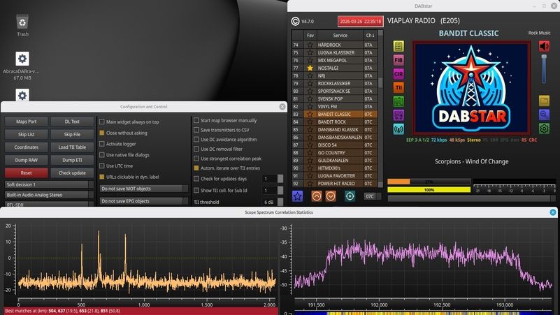 Ensemble: 0xE205 VIAPLAY RADIO [ VIAPLAY ] ECC: 0xE3, UTC 60 min, INT: 1, alarm announcements: 0 Services (16): 0xE09E SKÄRGÅRDSRADION [ SKÄRGÅRD ] ECC: 0xE3, Country: Sweden, PTy: Country Music (static), Announcements: No AudioComponent (primary), SCIdS: 0, Label: 'SKÄRGÅRDSRADION' [ 'SKÄRGÅRD' ], ASCTy: 0x3F (AAC) SubChId: 13, Language: Swedish, StartCU: 732, NumCU: 54, EEP 3-A, Coderate: 1/2, Bitrate: 72kbps UserApp 1/1: Label: '' [ '' ], UAType: 0x2 (SlideShow), X-PAD AppTy: 12, DSCTy: 0x3C (MOT), DG: 0, Data (2) [0C3C] 0xE241 RIX FM [ RIX FM ] ECC: 0xE3, Country: Sweden, PTy: Pop Music (static), Announcements: No AudioComponent (primary), SCIdS: 0, Label: 'RIX FM' [ 'RIX FM' ], ASCTy: 0x3F (AAC) SubChId: 1, Language: Swedish, StartCU: 0, NumCU: 72, EEP 3-A, Coderate: 1/2, Bitrate: 96kbps UserApp 1/1: Label: '' [ '' ], UAType: 0x2 (SlideShow), X-PAD AppTy: 12, DSCTy: 0x3C (MOT), DG: 0, Data (2) [0C3C] 0xE244 LUGNA FAVORITER [ LUGNA ] ECC: 0xE3, Country: Sweden, PTy: Pop Music (static), Announcements: No AudioComponent (primary), SCIdS: 0, Label: 'LUGNA FAVORITER' [ 'LUGNA' ], ASCTy: 0x3F (AAC) SubChId: 4, Language: Swedish, StartCU: 186, NumCU: 60, EEP 3-A, Coderate: 1/2, Bitrate: 80kbps UserApp 1/1: Label: '' [ '' ], UAType: 0x2 (SlideShow), X-PAD AppTy: 12, DSCTy: 0x3C (MOT), DG: 0, Data (2) [0C3C] 0xE245 JULKANALEN [ JULKANAL ] ECC: 0xE3, Country: Sweden, PTy: Pop Music (static), Announcements: No AudioComponent (primary), SCIdS: 0, Label: 'JULKANALEN' [ 'JULKANAL' ], ASCTy: 0x3F (AAC) SubChId: 2, Language: Swedish, StartCU: 72, NumCU: 60, EEP 3-A, Coderate: 1/2, Bitrate: 80kbps UserApp 1/1: Label: '' [ '' ], UAType: 0x2 (SlideShow), X-PAD AppTy: 12, DSCTy: 0x3C (MOT), DG: 0, Data (2) [0C3C] 0xE251 STAR FM [ STAR FM ] ECC: 0xE3, Country: Sweden, PTy: Pop Music (static), Announcements: No AudioComponent (primary), SCIdS: 0, Label: 'STAR FM' [ 'STAR FM' ], ASCTy: 0x3F (AAC) SubChId: 6, Language: Swedish, StartCU: 300, NumCU: 54, EEP 3-A, Coderate: 1/2, Bitrate: 72kbps UserApp 1/1: Label: '' [ '' ], UAType: 0x2 (SlideShow), X-PAD AppTy: 12, DSCTy: 0x3C (MOT), DG: 0, Data (2) [0C3C] 0xE252 BANDIT CLASSIC [ BANDIT C ] ECC: 0xE3, Country: Sweden, PTy: Rock Music (static), Announcements: No AudioComponent (primary), SCIdS: 0, Label: 'BANDIT CLASSIC' [ 'BANDIT C' ], ASCTy: 0x3F (AAC) SubChId: 7, Language: Swedish, StartCU: 354, NumCU: 54, EEP 3-A, Coderate: 1/2, Bitrate: 72kbps UserApp 1/1: Label: '' [ '' ], UAType: 0x2 (SlideShow), X-PAD AppTy: 12, DSCTy: 0x3C (MOT), DG: 0, Data (2) [0C3C] 0xE253 GO COUNTRY [ COUNTRY ] ECC: 0xE3, Country: Sweden, PTy: Country Music (static), Announcements: No AudioComponent (primary), SCIdS: 0, Label: 'GO COUNTRY' [ 'COUNTRY' ], ASCTy: 0x3F (AAC) SubChId: 8, Language: Swedish, StartCU: 408, NumCU: 54, EEP 3-A, Coderate: 1/2, Bitrate: 72kbps UserApp 1/1: Label: '' [ '' ], UAType: 0x2 (SlideShow), X-PAD AppTy: 12, DSCTy: 0x3C (MOT), DG: 0, Data (2) [0C3C] 0xE254 HITMIX90's [ HITMIX90 ] ECC: 0xE3, Country: Sweden, PTy: Pop Music (static), Announcements: No AudioComponent (primary), SCIdS: 0, Label: 'HITMIX90's' [ 'HITMIX90' ], ASCTy: 0x3F (AAC) SubChId: 9, Language: Swedish, StartCU: 462, NumCU: 54, EEP 3-A, Coderate: 1/2, Bitrate: 72kbps UserApp 1/1: Label: '' [ '' ], UAType: 0x2 (SlideShow), X-PAD AppTy: 12, DSCTy: 0x3C (MOT), DG: 0, Data (2) [0C3C] 0xE255 SONIC [ SONIC ] ECC: 0xE3, Country: Sweden, PTy: Pop Music (static), Announcements: No AudioComponent (primary), SCIdS: 0, Label: 'SONIC' [ 'SONIC' ], ASCTy: 0x3F (AAC) SubChId: 10, Language: Swedish, StartCU: 516, NumCU: 54, EEP 3-A, Coderate: 1/2, Bitrate: 72kbps UserApp 1/1: Label: '' [ '' ], UAType: 0x2 (SlideShow), X-PAD AppTy: 12, DSCTy: 0x3C (MOT), DG: 0, Data (2) [0C3C] 0xE256 RIX FM FRESH [ RIXFRESH ] ECC: 0xE3, Country: Sweden, PTy: Pop Music (static), Announcements: No AudioComponent (primary), SCIdS: 0, Label: 'RIX FM FRESH' [ 'RIXFRESH' ], ASCTy: 0x3F (AAC) SubChId: 11, Language: Swedish, StartCU: 570, NumCU: 54, EEP 3-A, Coderate: 1/2, Bitrate: 72kbps UserApp 1/1: Label: '' [ '' ], UAType: 0x2 (SlideShow), X-PAD AppTy: 12, DSCTy: 0x3C (MOT), DG: 0, Data (2) [0C3C] 0xE2A7 BANDIT ROCK [ BANDIT ] ECC: 0xE3, Country: Sweden, PTy: Rock Music (static), Announcements: No AudioComponent (primary), SCIdS: 0, Label: 'BANDIT ROCK' [ 'BANDIT' ], ASCTy: 0x3F (AAC) SubChId: 3, Language: Swedish, StartCU: 132, NumCU: 54, EEP 3-A, Coderate: 1/2, Bitrate: 72kbps UserApp 1/1: Label: '' [ '' ], UAType: 0x2 (SlideShow), X-PAD AppTy: 12, DSCTy: 0x3C (MOT), DG: 0, Data (2) [0C3C] 0xE377 DANSBAND KLASSIK [ DANS KLA ] ECC: 0xE3, Country: Sweden, PTy: Country Music (static), Announcements: No AudioComponent (primary), SCIdS: 0, Label: 'DANSBAND KLASSIK' [ 'DANS KLA' ], ASCTy: 0x3F (AAC) SubChId: 15, Language: Swedish, StartCU: 786, NumCU: 54, EEP 3-A, Coderate: 1/2, Bitrate: 72kbps UserApp 1/1: Label: '' [ '' ], UAType: 0x2 (SlideShow), X-PAD AppTy: 12, DSCTy: 0x3C (MOT), DG: 0, Data (2) [0C3C] 0xE378 GULDKANALEN [ GULD ] ECC: 0xE3, Country: Sweden, PTy: Pop Music (static), Announcements: No AudioComponent (primary), SCIdS: 0, Label: 'GULDKANALEN' [ 'GULD' ], ASCTy: 0x3F (AAC) SubChId: 12, Language: Swedish, StartCU: 624, NumCU: 54, EEP 3-A, Coderate: 1/2, Bitrate: 72kbps UserApp 1/1: Label: '' [ '' ], UAType: 0x2 (SlideShow), X-PAD AppTy: 12, DSCTy: 0x3C (MOT), DG: 0, Data (2) [0C3C] 0xE379 DANSBANDSKANALEN [ DANSBAND ] ECC: 0xE3, Country: Sweden, PTy: Country Music (static), Announcements: No AudioComponent (primary), SCIdS: 0, Label: 'DANSBANDSKANALEN' [ 'DANSBAND' ], ASCTy: 0x3F (AAC) SubChId: 14, Language: Swedish, StartCU: 678, NumCU: 54, EEP 3-A, Coderate: 1/2, Bitrate: 72kbps UserApp 1/1: Label: '' [ '' ], UAType: 0x2 (SlideShow), X-PAD AppTy: 12, DSCTy: 0x3C (MOT), DG: 0, Data (2) [0C3C] 0xE4A4 POWER HIT RADIO [ POWER ] ECC: 0xE3, Country: Sweden, PTy: Pop Music (static), Announcements: No AudioComponent (primary), SCIdS: 0, Label: 'POWER HIT RADIO' [ 'POWER' ], ASCTy: 0x3F (AAC) SubChId: 5, Langu