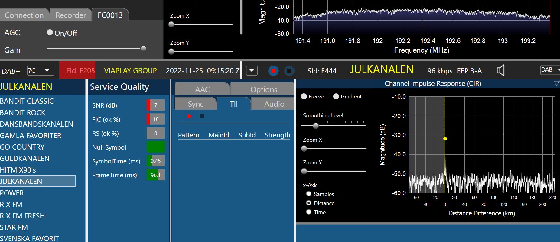 Ensemble 0xE205, Label: 'VIAPLAY GROUP', ShortLabel: 'VIAPLAY', LTO: +60 min, ECC: 0xE3, NumServices: 14 Audio-Service 0xE241, Label: 'RIX FM', ShortLabel: 'RIX FM', PTY: Pop Music (dynamic), AnnouncementSupport: No, NumComponents: 1 (Audio: 1, Data: 0) AudioComponent, SCIdS: 0, Label: '', ShortLabel: '', ASCTy: 0x3F (AAC), SubChId: 1, StartCU: 0, NumCU: 72, ErrorProt: EEP 3-A (FEC: 1/2), Datarate: 96 kbit/s, NumUserApps: 1 User App 1 / 1, Label: '', ShortLabel: '', DSCTy: 0x3C (MOT), X-PAD type: 12, UaType: 0x2 (Slideshow), DataLen: 2 [0C3C] Audio-Service 0xE245, Label: 'STAR FM', ShortLabel: 'STAR FM', PTY: Pop Music (dynamic), AnnouncementSupport: No, NumComponents: 1 (Audio: 1, Data: 0) AudioComponent, SCIdS: 0, Label: '', ShortLabel: '', ASCTy: 0x3F (AAC), SubChId: 2, StartCU: 72, NumCU: 72, ErrorProt: EEP 3-A (FEC: 1/2), Datarate: 96 kbit/s, NumUserApps: 1 User App 1 / 1, Label: '', ShortLabel: '', DSCTy: 0x3C (MOT), X-PAD type: 12, UaType: 0x2 (Slideshow), DataLen: 2 [0C3C] Audio-Service 0xE251, Label: 'GAMLA FAVORITER', ShortLabel: 'GAMLA', PTY: Pop Music (dynamic), AnnouncementSupport: No, NumComponents: 1 (Audio: 1, Data: 0) AudioComponent, SCIdS: 0, Label: '', ShortLabel: '', ASCTy: 0x3F (AAC), SubChId: 6, StartCU: 360, NumCU: 60, ErrorProt: EEP 3-A (FEC: 1/2), Datarate: 80 kbit/s, NumUserApps: 1 User App 1 / 1, Label: '', ShortLabel: '', DSCTy: 0x3C (MOT), X-PAD type: 12, UaType: 0x2 (Slideshow), DataLen: 2 [0C3C] Audio-Service 0xE252, Label: 'BANDIT CLASSIC', ShortLabel: 'BANDIT C', PTY: Rock Music (dynamic), AnnouncementSupport: No, NumComponents: 1 (Audio: 1, Data: 0) AudioComponent, SCIdS: 0, Label: '', ShortLabel: '', ASCTy: 0x3F (AAC), SubChId: 7, StartCU: 420, NumCU: 60, ErrorProt: EEP 3-A (FEC: 1/2), Datarate: 80 kbit/s, NumUserApps: 1 User App 1 / 1, Label: '', ShortLabel: '', DSCTy: 0x3C (MOT), X-PAD type: 12, UaType: 0x2 (Slideshow), DataLen: 2 [0C3C] Audio-Service 0xE253, Label: 'GO COUNTRY', ShortLabel: 'COUNTRY', PTY: Country Music (dynamic), AnnouncementSupport: No, NumComponents: 1 (Audio: 1, Data: 0) AudioComponent, SCIdS: 0, Label: '', ShortLabel: '', ASCTy: 0x3F (AAC), SubChId: 8, StartCU: 480, NumCU: 60, ErrorProt: EEP 3-A (FEC: 1/2), Datarate: 80 kbit/s, NumUserApps: 1 User App 1 / 1, Label: '', ShortLabel: '', DSCTy: 0x3C (MOT), X-PAD type: 12, UaType: 0x2 (Slideshow), DataLen: 2 [0C3C] Audio-Service 0xE254, Label: 'HITMIX90's', ShortLabel: 'HITMIX90', PTY: Pop Music (dynamic), AnnouncementSupport: No, NumComponents: 1 (Audio: 1, Data: 0) AudioComponent, SCIdS: 0, Label: '', ShortLabel: '', ASCTy: 0x3F (AAC), SubChId: 9, StartCU: 540, NumCU: 60, ErrorProt: EEP 3-A (FEC: 1/2), Datarate: 80 kbit/s, NumUserApps: 1 User App 1 / 1, Label: '', ShortLabel: '', DSCTy: 0x3C (MOT), X-PAD type: 12, UaType: 0x2 (Slideshow), DataLen: 2 [0C3C] Audio-Service 0xE255, Label: 'SVENSKA FAVORIT', ShortLabel: 'SVENSKA', PTY: Pop Music (dynamic), AnnouncementSupport: No, NumComponents: 1 (Audio: 1, Data: 0) AudioComponent, SCIdS: 0, Label: '', ShortLabel: '', ASCTy: 0x3F (AAC), SubChId: 10, StartCU: 600, NumCU: 60, ErrorProt: EEP 3-A (FEC: 1/2), Datarate: 80 kbit/s, NumUserApps: 1 User App 1 / 1, Label: '', ShortLabel: '', DSCTy: 0x3C (MOT), X-PAD type: 12, UaType: 0x2 (Slideshow), DataLen: 2 [0C3C] Audio-Service 0xE256, Label: 'RIX FM FRESH', ShortLabel: 'RIXFRESH', PTY: Pop Music (dynamic), AnnouncementSupport: No, NumComponents: 1 (Audio: 1, Data: 0) AudioComponent, SCIdS: 0, Label: '', ShortLabel: '', ASCTy: 0x3F (AAC), SubChId: 11, StartCU: 660, NumCU: 60, ErrorProt: EEP 3-A (FEC: 1/2), Datarate: 80 kbit/s, NumUserApps: 1 User App 1 / 1, Label: '', ShortLabel: '', DSCTy: 0x3C (MOT), X-PAD type: 12, UaType: 0x2 (Slideshow), DataLen: 2 [0C3C] Audio-Service 0xE2A7, Label: 'BANDIT ROCK', ShortLabel: 'BANDIT', PTY: Rock Music (dynamic), AnnouncementSupport: No, NumComponents: 1 (Audio: 1, Data: 0) AudioComponent, SCIdS: 0, Label: '', ShortLabel: '', ASCTy: 0x3F (AAC), SubChId: 3, StartCU: 144, NumCU: 72, ErrorProt: EEP 3-A (FEC: 1/2), Datarate: 96 kbit/s, NumUserApps: 1 User App 1 / 1, Label: '', ShortLabel: '', DSCTy: 0x3C (MOT), X-PAD type: 12, UaType: 0x2 (Slideshow), DataLen: 2 [0C3C] Audio-Service 0xE378, Label: 'GULDKANALEN', ShortLabel: 'GULD', PTY: Pop Music (dynamic), AnnouncementSupport: No, NumComponents: 1 (Audio: 1, Data: 0) AudioComponent, SCIdS: 0, Label: '', ShortLabel: '', ASCTy: 0x3F (AAC), SubChId: 12, StartCU: 720, NumCU: 60, ErrorProt: EEP 3-A (FEC: 1/2), Datarate: 80 kbit/s, NumUserApps: 1 User App 1 / 1, Label: '', ShortLabel: '', DSCTy: 0x3C (MOT), X-PAD type: 12, UaType: 0x2 (Slideshow), DataLen: 2 [0C3C] Audio-Service 0xE379, Label: 'DANSBANDSKANALEN', ShortLabel: 'DANSBAND', PTY: Country Music (dynamic), AnnouncementSupport: No, NumComponents: 1 (Audio: 1, Data: 0) AudioComponent, SCIdS: 0, Label: '', ShortLabel: '', ASCTy: 0x3F (AAC), SubChId: 14, StartCU: 780, NumCU: 60, ErrorProt: EEP 3-A (FEC: 1/2), Datarate: 80 kbit/s, NumUserApps: 1 User App 1 / 1, Label: '', ShortLabel: '', DSCTy: 0x3C (MOT), X-PAD type: 12, UaType: 0x2 (Slideshow), DataLen: 2 [0C3C] Audio-Service 0xE444, Label: 'JULKANALEN', ShortLabel: 'JULKANAL', PTY: Pop Music (dynamic), AnnouncementSupport: No, NumComponents: 1 (Audio: 1, Data: 0) AudioComponent, SCIdS: 0, Label: '', ShortLabel: '', ASCTy: 0x3F (AAC), SubChId: 4, StartCU: 216, NumCU: 72, ErrorProt: EEP 3-A (FEC: 1/2), Datarate: 96 kbit/s, NumUserApps: 1 User App 1 / 1, Label: '', ShortLabel: '', DSCTy: 0x3C (MOT), X-PAD type: 12, UaType: 0x2 (Slideshow), DataLen: 2 [0C3C] Audio-Service 0xE4A4, Label: 'POWER', ShortLabel: 'POWER', PTY: Pop Music (dynamic), AnnouncementSupport: No, NumComponents: 1 (Audio: 1, Data: 0) AudioComponent, SCIdS: 0, Label: '', ShortLabel: '', ASCTy: 0x3F (AAC), SubChId: 5, StartCU: 288, NumCU: 72, ErrorProt: EEP 3-A (FEC: 1/2), Datarate: 96 kbit/s, NumUserApps: 1 User App 1 / 1, Label: '', ShortLabel: '', DSCTy: 0x3C (MOT), X-PAD type: 12, UaType: 0x2 (Slideshow), DataLen: 2 [0C3C] Data-Service 