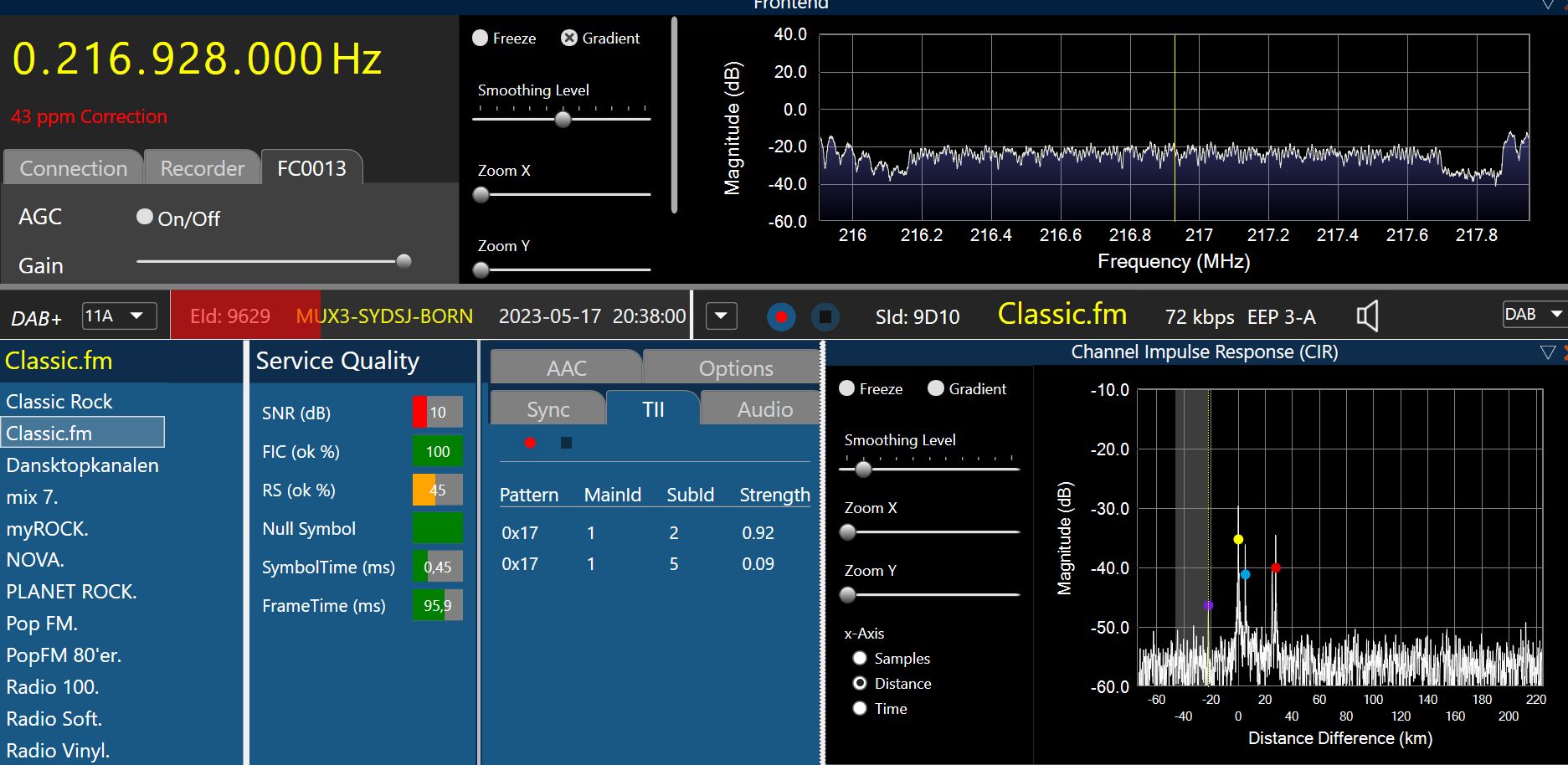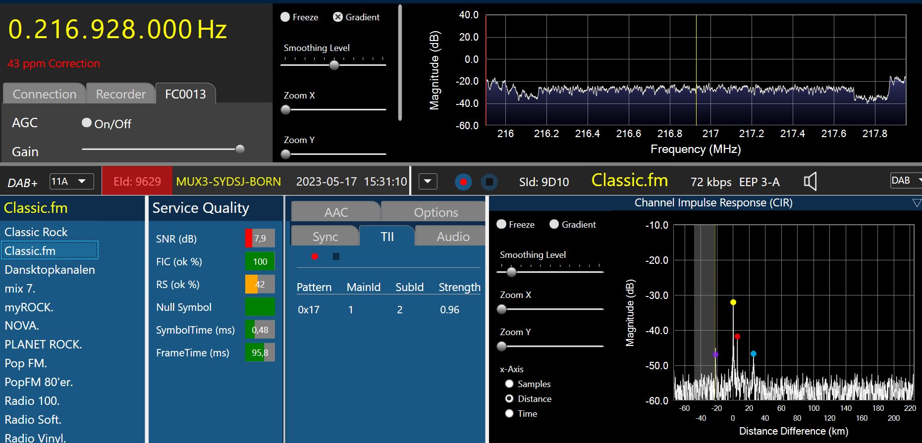 Ensemble 0x9629, Label: 'MUX3-SYDSJ-BORN', ShortLabel: 'MUX3-SDB', LTO: +120 min, ECC: 0xE1, AlarmFlag: 1, NumServices: 17 Audio-Service 0x91AA, Label: 'SLR Næstved', ShortLabel: 'SLR Næst', PTY: Pop Music (dynamic), AnnouncementSupport: No, NumComponents: 1 (Audio: 1, Data: 0) AudioComponent, SCIdS: 0, Label: '', ShortLabel: '', ASCTy: 0x3F (AAC), SubChId: 16, StartCU: 756, NumCU: 54, ErrorProt: EEP 3-A (FEC: 1/2), Datarate: 72 kbit/s, NumUserApps: 1 User App 1 / 1, Label: '', ShortLabel: '', DSCTy: 0x3C (MOT), X-PAD type: 12, UaType: 0x2 (Slideshow), DataLen: 2 [0C3C] Audio-Service 0x91BB, Label: 'PopFM 80'er.', ShortLabel: 'PopFM 80', PTY: Pop Music (dynamic), AnnouncementSupport: No, NumComponents: 1 (Audio: 1, Data: 0) AudioComponent, SCIdS: 0, Label: '', ShortLabel: '', ASCTy: 0x3F (AAC), SubChId: 8, StartCU: 348, NumCU: 42, ErrorProt: EEP 3-A (FEC: 1/2), Datarate: 56 kbit/s, NumUserApps: 1 User App 1 / 1, Label: '', ShortLabel: '', DSCTy: 0x3C (MOT), X-PAD type: 12, UaType: 0x2 (Slideshow), DataLen: 2 [0C3C] Audio-Service 0x91CD, Label: 'Classic Rock', ShortLabel: 'Cla Rock', PTY: Rock Music (dynamic), AnnouncementSupport: No, NumComponents: 1 (Audio: 1, Data: 0) AudioComponent, SCIdS: 0, Label: '', ShortLabel: '', ASCTy: 0x3F (AAC), SubChId: 11, StartCU: 486, NumCU: 54, ErrorProt: EEP 3-A (FEC: 1/2), Datarate: 72 kbit/s, NumUserApps: 1 User App 1 / 1, Label: '', ShortLabel: '', DSCTy: 0x3C (MOT), X-PAD type: 12, UaType: 0x2 (Slideshow), DataLen: 2 [0C3C] Audio-Service 0x91CF, Label: 'Dansktopkanalen', ShortLabel: 'Dansktop', PTY: Pop Music (dynamic), AnnouncementSupport: No, NumComponents: 1 (Audio: 1, Data: 0) AudioComponent, SCIdS: 0, Label: '', ShortLabel: '', ASCTy: 0x3F (AAC), SubChId: 10, StartCU: 432, NumCU: 54, ErrorProt: EEP 3-A (FEC: 1/2), Datarate: 72 kbit/s, NumUserApps: 1 User App 1 / 1, Label: '', ShortLabel: '', DSCTy: 0x3C (MOT), X-PAD type: 12, UaType: 0x2 (Slideshow), DataLen: 2 [0C3C] Audio-Service 0x9205, Label: 'NOVA.', ShortLabel: 'NOVA.', PTY: Pop Music (dynamic), AnnouncementSupport: No, NumComponents: 1 (Audio: 1, Data: 0) AudioComponent, SCIdS: 0, Label: '', ShortLabel: '', ASCTy: 0x3F (AAC), SubChId: 0, StartCU: 168, NumCU: 54, ErrorProt: EEP 3-A (FEC: 1/2), Datarate: 72 kbit/s, NumUserApps: 1 User App 1 / 1, Label: '', ShortLabel: '', DSCTy: 0x3C (MOT), X-PAD type: 12, UaType: 0x2 (Slideshow), DataLen: 2 [0C3C] Audio-Service 0x9206, Label: 'Pop FM.', ShortLabel: 'Pop FM', PTY: Pop Music (dynamic), AnnouncementSupport: No, NumComponents: 1 (Audio: 1, Data: 0) AudioComponent, SCIdS: 0, Label: '', ShortLabel: '', ASCTy: 0x3F (AAC), SubChId: 1, StartCU: 222, NumCU: 42, ErrorProt: EEP 3-A (FEC: 1/2), Datarate: 56 kbit/s, NumUserApps: 1 User App 1 / 1, Label: '', ShortLabel: '', DSCTy: 0x3C (MOT), X-PAD type: 12, UaType: 0x2 (Slideshow), DataLen: 2 [0C3C] Audio-Service 0x9619, Label: 'The Voice.', ShortLabel: 'TheVoice', PTY: Pop Music (dynamic), AnnouncementSupport: No, NumComponents: 1 (Audio: 1, Data: 0) AudioComponent, SCIdS: 0, Label: '', ShortLabel: '', ASCTy: 0x3F (AAC), SubChId: 5, StartCU: 42, NumCU: 42, ErrorProt: EEP 3-A (FEC: 1/2), Datarate: 56 kbit/s, NumUserApps: 1 User App 1 / 1, Label: '', ShortLabel: '', DSCTy: 0x3C (MOT), X-PAD type: 12, UaType: 0x2 (Slideshow), DataLen: 2 [0C3C] Audio-Service 0x9624, Label: 'myROCK.', ShortLabel: 'myROCK', PTY: Rock Music (dynamic), AnnouncementSupport: No, NumComponents: 1 (Audio: 1, Data: 0) AudioComponent, SCIdS: 0, Label: '', ShortLabel: '', ASCTy: 0x3F (AAC), SubChId: 4, StartCU: 0, NumCU: 42, ErrorProt: EEP 3-A (FEC: 1/2), Datarate: 56 kbit/s, NumUserApps: 1 User App 1 / 1, Label: '', ShortLabel: '', DSCTy: 0x3C (MOT), X-PAD type: 12, UaType: 0x2 (Slideshow), DataLen: 2 [0C3C] Audio-Service 0x96EA, Label: 'PLANET ROCK.', ShortLabel: 'PL ROCK', PTY: Rock Music (dynamic), AnnouncementSupport: No, NumComponents: 1 (Audio: 1, Data: 0) AudioComponent, SCIdS: 0, Label: '', ShortLabel: '', ASCTy: 0x3F (AAC), SubChId: 9, StartCU: 390, NumCU: 42, ErrorProt: EEP 3-A (FEC: 1/2), Datarate: 56 kbit/s, NumUserApps: 1 User App 1 / 1, Label: '', ShortLabel: '', DSCTy: 0x3C (MOT), X-PAD type: 12, UaType: 0x2 (Slideshow), DataLen: 2 [0C3C] Audio-Service 0x9729, Label: 'Radio Vinyl.', ShortLabel: ' Vinyl.', PTY: Oldies Music (dynamic), AnnouncementSupport: No, NumComponents: 1 (Audio: 1, Data: 0) AudioComponent, SCIdS: 0, Label: '', ShortLabel: '', ASCTy: 0x3F (AAC), SubChId: 3, StartCU: 306, NumCU: 42, ErrorProt: EEP 3-A (FEC: 1/2), Datarate: 56 kbit/s, NumUserApps: 1 User App 1 / 1, Label: '', ShortLabel: '', DSCTy: 0x3C (MOT), X-PAD type: 12, UaType: 0x2 (Slideshow), DataLen: 2 [0C3C] Audio-Service 0x973F, Label: 'Radio 100.', ShortLabel: 'Radio100', PTY: Pop Music (dynamic), AnnouncementSupport: No, NumComponents: 1 (Audio: 1, Data: 0) AudioComponent, SCIdS: 0, Label: '', ShortLabel: '', ASCTy: 0x3F (AAC), SubChId: 6, StartCU: 84, NumCU: 42, ErrorProt: EEP 3-A (FEC: 1/2), Datarate: 56 kbit/s, NumUserApps: 1 User App 1 / 1, Label: '', ShortLabel: '', DSCTy: 0x3C (MOT), X-PAD type: 12, UaType: 0x2 (Slideshow), DataLen: 2 [0C3C] Audio-Service 0x97A2, Label: 'Radio Soft.', ShortLabel: 'R Soft', PTY: Pop Music (dynamic), AnnouncementSupport: No, NumComponents: 1 (Audio: 1, Data: 0) AudioComponent, SCIdS: 0, Label: '', ShortLabel: '', ASCTy: 0x3F (AAC), SubChId: 7, StartCU: 126, NumCU: 42, ErrorProt: EEP 3-A (FEC: 1/2), Datarate: 56 kbit/s, NumUserApps: 1 User App 1 / 1, Label: '', ShortLabel: '', DSCTy: 0x3C (MOT), X-PAD type: 12, UaType: 0x2 (Slideshow), DataLen: 2 [0C3C] Audio-Service 0x9987, Label: 'SydhavsØerne', ShortLabel: 'SydhavsØ', PTY: Pop Music (dynamic), AnnouncementSupport: No, NumComponents: 1 (Audio: 1, Data: 0) AudioComponent, SCIdS: 0, Label: '', ShortLabel: '', ASCTy: 0x3F (AAC), SubChId: 14, StartCU: 648, NumCU: 54, ErrorProt: EEP 3-A (FEC: 1/2), Datarate: 72 kbit/s, NumUserApps: 1 User App 1 / 1, Label: '', ShortLabel: '', DSCTy: 0x3C (MOT), X-PAD type: 12, UaType: 0x2 (Slideshow), DataLen: 2 [0C