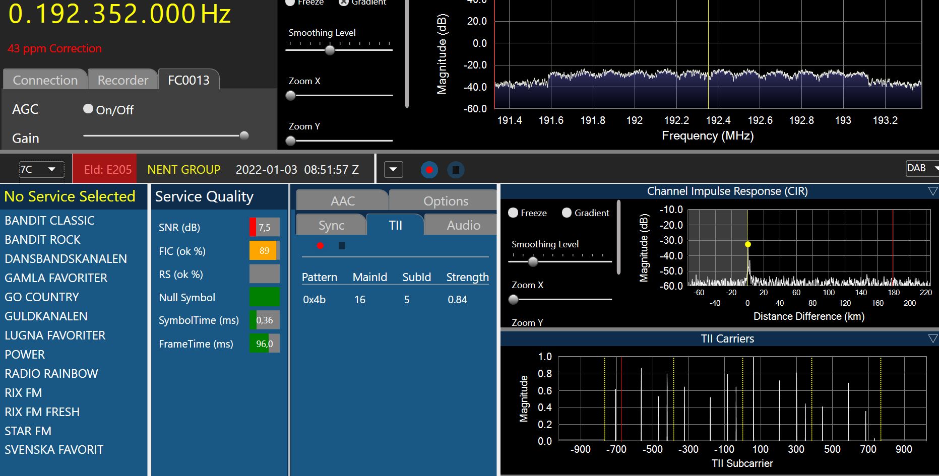 Ensemble 0xE205, Label: 'NENT GROUP', ShortLabel: 'NENT GRP', LTO: +60 min, ECC: 0xE3, NumServices: 14 Audio-Service 0xE241, Label: 'RIX FM', ShortLabel: 'RIX FM', PTY: Pop Music (dynamic), AnnouncementSupport: No, NumComponents: 1 (Audio: 1, Data: 0) AudioComponent, SCIdS: 0, Label: '', ShortLabel: '', ASCTy: 0x3F (AAC), SubChId: 1, StartCU: 0, NumCU: 72, ErrorProt: EEP 3-A (FEC: 1/2), Datarate: 96 kbit/s, NumUserApps: 1 User App 1 / 1, Label: '', ShortLabel: '', DSCTy: 0x3C (MOT), X-PAD type: 12, UaType: 0x2 (Slideshow), DataLen: 2 [0C3C] Audio-Service 0xE245, Label: 'STAR FM', ShortLabel: 'STAR FM', PTY: Pop Music (dynamic), AnnouncementSupport: No, NumComponents: 1 (Audio: 1, Data: 0) AudioComponent, SCIdS: 0, Label: '', ShortLabel: '', ASCTy: 0x3F (AAC), SubChId: 2, StartCU: 72, NumCU: 72, ErrorProt: EEP 3-A (FEC: 1/2), Datarate: 96 kbit/s, NumUserApps: 1 User App 1 / 1, Label: '', ShortLabel: '', DSCTy: 0x3C (MOT), X-PAD type: 12, UaType: 0x2 (Slideshow), DataLen: 2 [0C3C] Audio-Service 0xE251, Label: 'GAMLA FAVORITER', ShortLabel: 'GAMLA', PTY: Pop Music (dynamic), AnnouncementSupport: No, NumComponents: 1 (Audio: 1, Data: 0) AudioComponent, SCIdS: 0, Label: '', ShortLabel: '', ASCTy: 0x3F (AAC), SubChId: 6, StartCU: 348, NumCU: 60, ErrorProt: EEP 3-A (FEC: 1/2), Datarate: 80 kbit/s, NumUserApps: 1 User App 1 / 1, Label: '', ShortLabel: '', DSCTy: 0x3C (MOT), X-PAD type: 12, UaType: 0x2 (Slideshow), DataLen: 2 [0C3C] Audio-Service 0xE252, Label: 'BANDIT CLASSIC', ShortLabel: 'BANDIT C', PTY: Rock Music (dynamic), AnnouncementSupport: No, NumComponents: 1 (Audio: 1, Data: 0) AudioComponent, SCIdS: 0, Label: '', ShortLabel: '', ASCTy: 0x3F (AAC), SubChId: 7, StartCU: 408, NumCU: 60, ErrorProt: EEP 3-A (FEC: 1/2), Datarate: 80 kbit/s, NumUserApps: 1 User App 1 / 1, Label: '', ShortLabel: '', DSCTy: 0x3C (MOT), X-PAD type: 12, UaType: 0x2 (Slideshow), DataLen: 2 [0C3C] Audio-Service 0xE253, Label: 'GO COUNTRY', ShortLabel: 'COUNTRY', PTY: Country Music (dynamic), AnnouncementSupport: No, NumComponents: 1 (Audio: 1, Data: 0) AudioComponent, SCIdS: 0, Label: '', ShortLabel: '', ASCTy: 0x3F (AAC), SubChId: 8, StartCU: 468, NumCU: 60, ErrorProt: EEP 3-A (FEC: 1/2), Datarate: 80 kbit/s, NumUserApps: 1 User App 1 / 1, Label: '', ShortLabel: '', DSCTy: 0x3C (MOT), X-PAD type: 12, UaType: 0x2 (Slideshow), DataLen: 2 [0C3C] Audio-Service 0xE254, Label: 'RADIO RAINBOW', ShortLabel: 'RAINBOW', PTY: Pop Music (dynamic), AnnouncementSupport: No, NumComponents: 1 (Audio: 1, Data: 0) AudioComponent, SCIdS: 0, Label: '', ShortLabel: '', ASCTy: 0x3F (AAC), SubChId: 9, StartCU: 528, NumCU: 60, ErrorProt: EEP 3-A (FEC: 1/2), Datarate: 80 kbit/s, NumUserApps: 1 User App 1 / 1, Label: '', ShortLabel: '', DSCTy: 0x3C (MOT), X-PAD type: 12, UaType: 0x2 (Slideshow), DataLen: 2 [0C3C] Audio-Service 0xE255, Label: 'SVENSKA FAVORIT', ShortLabel: 'SVENSKA', PTY: Pop Music (dynamic), AnnouncementSupport: No, NumComponents: 1 (Audio: 1, Data: 0) AudioComponent, SCIdS: 0, Label: '', ShortLabel: '', ASCTy: 0x3F (AAC), SubChId: 10, StartCU: 588, NumCU: 60, ErrorProt: EEP 3-A (FEC: 1/2), Datarate: 80 kbit/s, NumUserApps: 1 User App 1 / 1, Label: '', ShortLabel: '', DSCTy: 0x3C (MOT), X-PAD type: 12, UaType: 0x2 (Slideshow), DataLen: 2 [0C3C] Audio-Service 0xE256, Label: 'RIX FM FRESH', ShortLabel: 'RIXFRESH', PTY: Pop Music (dynamic), AnnouncementSupport: No, NumComponents: 1 (Audio: 1, Data: 0) AudioComponent, SCIdS: 0, Label: '', ShortLabel: '', ASCTy: 0x3F (AAC), SubChId: 11, StartCU: 648, NumCU: 60, ErrorProt: EEP 3-A (FEC: 1/2), Datarate: 80 kbit/s, NumUserApps: 1 User App 1 / 1, Label: '', ShortLabel: '', DSCTy: 0x3C (MOT), X-PAD type: 12, UaType: 0x2 (Slideshow), DataLen: 2 [0C3C] Audio-Service 0xE2A7, Label: 'BANDIT ROCK', ShortLabel: 'BANDIT', PTY: Rock Music (dynamic), AnnouncementSupport: No, NumComponents: 1 (Audio: 1, Data: 0) AudioComponent, SCIdS: 0, Label: '', ShortLabel: '', ASCTy: 0x3F (AAC), SubChId: 3, StartCU: 144, NumCU: 72, ErrorProt: EEP 3-A (FEC: 1/2), Datarate: 96 kbit/s, NumUserApps: 1 User App 1 / 1, Label: '', ShortLabel: '', DSCTy: 0x3C (MOT), X-PAD type: 12, UaType: 0x2 (Slideshow), DataLen: 2 [0C3C] Audio-Service 0xE378, Label: 'GULDKANALEN', ShortLabel: 'GULD', PTY: -, AnnouncementSupport: No, NumComponents: 1 (Audio: 1, Data: 0) AudioComponent, SCIdS: 0, Label: '', ShortLabel: '', ASCTy: 0x3F (AAC), SubChId: 12, StartCU: 708, NumCU: 60, ErrorProt: EEP 3-A (FEC: 1/2), Datarate: 80 kbit/s, NumUserApps: 1 User App 1 / 1, Label: '', ShortLabel: '', DSCTy: 0x3C (MOT), X-PAD type: 12, UaType: 0x2 (Slideshow), DataLen: 2 [0C3C] Audio-Service 0xE379, Label: 'DANSBANDSKANALEN', ShortLabel: 'DANSBAND', PTY: -, AnnouncementSupport: No, NumComponents: 1 (Audio: 1, Data: 0) AudioComponent, SCIdS: 0, Label: '', ShortLabel: '', ASCTy: 0x3F (AAC), SubChId: 14, StartCU: 768, NumCU: 60, ErrorProt: EEP 3-A (FEC: 1/2), Datarate: 80 kbit/s, NumUserApps: 1 User App 1 / 1, Label: '', ShortLabel: '', DSCTy: 0x3C (MOT), X-PAD type: 12, UaType: 0x2 (Slideshow), DataLen: 2 [0C3C] Audio-Service 0xE444, Label: 'JULKANALEN', ShortLabel: 'JULKANAL', PTY: Pop Music (dynamic), AnnouncementSupport: No, NumComponents: 1 (Audio: 1, Data: 0) AudioComponent, SCIdS: 0, Label: '', ShortLabel: '', ASCTy: 0x3F (AAC), SubChId: 4, StartCU: 216, NumCU: 72, ErrorProt: EEP 3-A (FEC: 1/2), Datarate: 96 kbit/s, NumUserApps: 1 User App 1 / 1, Label: '', ShortLabel: '', DSCTy: 0x3C (MOT), X-PAD type: 12, UaType: 0x2 (Slideshow), DataLen: 2 [0C3C] Audio-Service 0xE4A4, Label: 'POWER', ShortLabel: 'POWER', PTY: Pop Music (dynamic), AnnouncementSupport: No, NumComponents: 1 (Audio: 1, Data: 0) AudioComponent, SCIdS: 0, Label: '', ShortLabel: '', ASCTy: 0x3F (AAC), SubChId: 5, StartCU: 288, NumCU: 60, ErrorProt: EEP 3-A (FEC: 1/2), Datarate: 80 kbit/s, NumUserApps: 1 User App 1 / 1, Label: '', ShortLabel: '', DSCTy: 0x3C (MOT), X-PAD type: 12, UaType: 0x2 (Slideshow), DataLen: 2 [0C3C] Data-Service 0xE3E00000, Label: 'SPI', ShortLabel: 'S