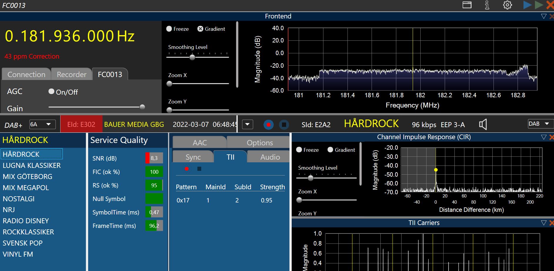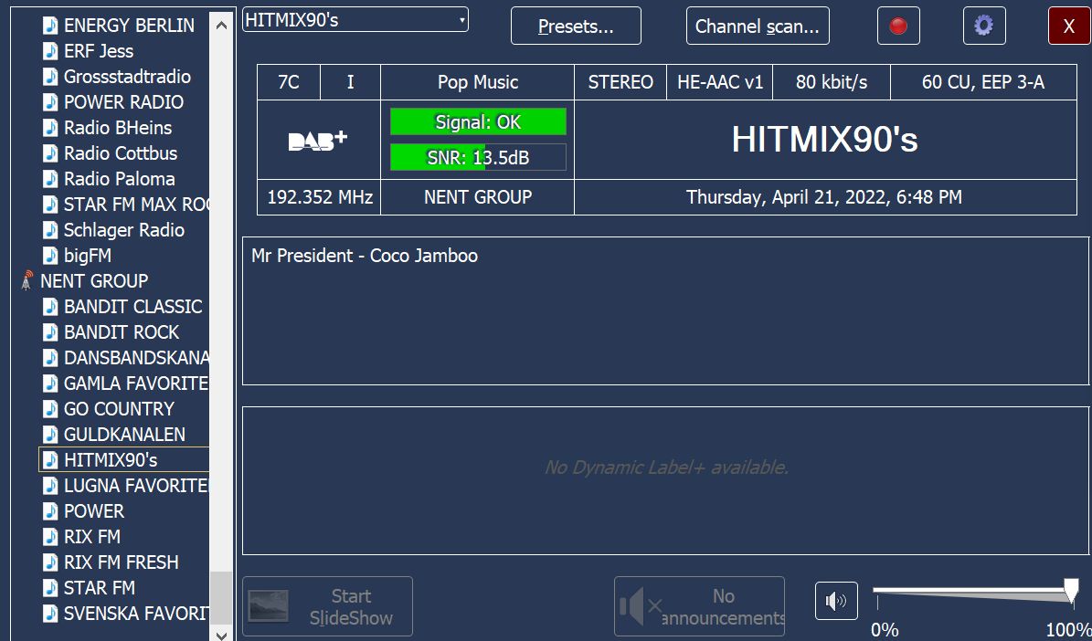 Nent im 7C Malmoe nun doch wieder mit einem Programm fuer Musik der 90er.  Rainbow wurde ersetzt. Ensemble 0xE205, Label: 'NENT GROUP', ShortLabel: 'NENT GRP', LTO: +120 min, ECC: 0xE3, NumServices: 14 Audio-Service 0xE241, Label: 'RIX FM', ShortLabel: 'RIX FM', PTY: Pop Music (dynamic), AnnouncementSupport: No, NumComponents: 1 (Audio: 1, Data: 0) AudioComponent, SCIdS: 0, Label: '', ShortLabel: '', ASCTy: 0x3F (AAC), SubChId: 1, StartCU: 0, NumCU: 72, ErrorProt: EEP 3-A (FEC: 1/2), Datarate: 96 kbit/s, NumUserApps: 1 User App 1 / 1, Label: '', ShortLabel: '', DSCTy: 0x3C (MOT), X-PAD type: 12, UaType: 0x2 (Slideshow), DataLen: 2 [0C3C] Audio-Service 0xE245, Label: 'STAR FM', ShortLabel: 'STAR FM', PTY: Pop Music (dynamic), AnnouncementSupport: No, NumComponents: 1 (Audio: 1, Data: 0) AudioComponent, SCIdS: 0, Label: '', ShortLabel: '', ASCTy: 0x3F (AAC), SubChId: 2, StartCU: 72, NumCU: 72, ErrorProt: EEP 3-A (FEC: 1/2), Datarate: 96 kbit/s, NumUserApps: 1 User App 1 / 1, Label: '', ShortLabel: '', DSCTy: 0x3C (MOT), X-PAD type: 12, UaType: 0x2 (Slideshow), DataLen: 2 [0C3C] Audio-Service 0xE251, Label: 'GAMLA FAVORITER', ShortLabel: 'GAMLA', PTY: Pop Music (dynamic), AnnouncementSupport: No, NumComponents: 1 (Audio: 1, Data: 0) AudioComponent, SCIdS: 0, Label: '', ShortLabel: '', ASCTy: 0x3F (AAC), SubChId: 6, StartCU: 360, NumCU: 60, ErrorProt: EEP 3-A (FEC: 1/2), Datarate: 80 kbit/s, NumUserApps: 1 User App 1 / 1, Label: '', ShortLabel: '', DSCTy: 0x3C (MOT), X-PAD type: 12, UaType: 0x2 (Slideshow), DataLen: 2 [0C3C] Audio-Service 0xE252, Label: 'BANDIT CLASSIC', ShortLabel: 'BANDIT C', PTY: Rock Music (dynamic), AnnouncementSupport: No, NumComponents: 1 (Audio: 1, Data: 0) AudioComponent, SCIdS: 0, Label: '', ShortLabel: '', ASCTy: 0x3F (AAC), SubChId: 7, StartCU: 420, NumCU: 60, ErrorProt: EEP 3-A (FEC: 1/2), Datarate: 80 kbit/s, NumUserApps: 1 User App 1 / 1, Label: '', ShortLabel: '', DSCTy: 0x3C (MOT), X-PAD type: 12, UaType: 0x2 (Slideshow), DataLen: 2 [0C3C] Audio-Service 0xE253, Label: 'GO COUNTRY', ShortLabel: 'COUNTRY', PTY: Country Music (dynamic), AnnouncementSupport: No, NumComponents: 1 (Audio: 1, Data: 0) AudioComponent, SCIdS: 0, Label: '', ShortLabel: '', ASCTy: 0x3F (AAC), SubChId: 8, StartCU: 480, NumCU: 60, ErrorProt: EEP 3-A (FEC: 1/2), Datarate: 80 kbit/s, NumUserApps: 1 User App 1 / 1, Label: '', ShortLabel: '', DSCTy: 0x3C (MOT), X-PAD type: 12, UaType: 0x2 (Slideshow), DataLen: 2 [0C3C] Audio-Service 0xE254, Label: 'HITMIX90's', ShortLabel: 'HITMIX90', PTY: Pop Music (dynamic), AnnouncementSupport: No, NumComponents: 1 (Audio: 1, Data: 0) AudioComponent, SCIdS: 0, Label: '', ShortLabel: '', ASCTy: 0x3F (AAC), SubChId: 9, StartCU: 540, NumCU: 60, ErrorProt: EEP 3-A (FEC: 1/2), Datarate: 80 kbit/s, NumUserApps: 1 User App 1 / 1, Label: '', ShortLabel: '', DSCTy: 0x3C (MOT), X-PAD type: 12, UaType: 0x2 (Slideshow), DataLen: 2 [0C3C] Audio-Service 0xE255, Label: 'SVENSKA FAVORIT', ShortLabel: 'SVENSKA', PTY: Pop Music (dynamic), AnnouncementSupport: No, NumComponents: 1 (Audio: 1, Data: 0) AudioComponent, SCIdS: 0, Label: '', ShortLabel: '', ASCTy: 0x3F (AAC), SubChId: 10, StartCU: 600, NumCU: 60, ErrorProt: EEP 3-A (FEC: 1/2), Datarate: 80 kbit/s, NumUserApps: 1 User App 1 / 1, Label: '', ShortLabel: '', DSCTy: 0x3C (MOT), X-PAD type: 12, UaType: 0x2 (Slideshow), DataLen: 2 [0C3C] Audio-Service 0xE256, Label: 'RIX FM FRESH', ShortLabel: 'RIXFRESH', PTY: Pop Music (dynamic), AnnouncementSupport: No, NumComponents: 1 (Audio: 1, Data: 0) AudioComponent, SCIdS: 0, Label: '', ShortLabel: '', ASCTy: 0x3F (AAC), SubChId: 11, StartCU: 660, NumCU: 60, ErrorProt: EEP 3-A (FEC: 1/2), Datarate: 80 kbit/s, NumUserApps: 1 User App 1 / 1, Label: '', ShortLabel: '', DSCTy: 0x3C (MOT), X-PAD type: 12, UaType: 0x2 (Slideshow), DataLen: 2 [0C3C] Audio-Service 0xE2A7, Label: 'BANDIT ROCK', ShortLabel: 'BANDIT', PTY: Rock Music (dynamic), AnnouncementSupport: No, NumComponents: 1 (Audio: 1, Data: 0) AudioComponent, SCIdS: 0, Label: '', ShortLabel: '', ASCTy: 0x3F (AAC), SubChId: 3, StartCU: 144, NumCU: 72, ErrorProt: EEP 3-A (FEC: 1/2), Datarate: 96 kbit/s, NumUserApps: 1 User App 1 / 1, Label: '', ShortLabel: '', DSCTy: 0x3C (MOT), X-PAD type: 12, UaType: 0x2 (Slideshow), DataLen: 2 [0C3C] Audio-Service 0xE378, Label: 'GULDKANALEN', ShortLabel: 'GULD', PTY: Pop Music (dynamic), AnnouncementSupport: No, NumComponents: 1 (Audio: 1, Data: 0) AudioComponent, SCIdS: 0, Label: '', ShortLabel: '', ASCTy: 0x3F (AAC), SubChId: 12, StartCU: 720, NumCU: 60, ErrorProt: EEP 3-A (FEC: 1/2), Datarate: 80 kbit/s, NumUserApps: 1 User App 1 / 1, Label: '', ShortLabel: '', DSCTy: 0x3C (MOT), X-PAD type: 12, UaType: 0x2 (Slideshow), DataLen: 2 [0C3C] Audio-Service 0xE379, Label: 'DANSBANDSKANALEN', ShortLabel: 'DANSBAND', PTY: Country Music (dynamic), AnnouncementSupport: No, NumComponents: 1 (Audio: 1, Data: 0) AudioComponent, SCIdS: 0, Label: '', ShortLabel: '', ASCTy: 0x3F (AAC), SubChId: 14, StartCU: 780, NumCU: 60, ErrorProt: EEP 3-A (FEC: 1/2), Datarate: 80 kbit/s, NumUserApps: 1 User App 1 / 1, Label: '', ShortLabel: '', DSCTy: 0x3C (MOT), X-PAD type: 12, UaType: 0x2 (Slideshow), DataLen: 2 [0C3C] Audio-Service 0xE444, Label: 'LUGNA FAVORITER', ShortLabel: 'LUGNA', PTY: Pop Music (dynamic), AnnouncementSupport: No, NumComponents: 1 (Audio: 1, Data: 0) AudioComponent, SCIdS: 0, Label: '', ShortLabel: '', ASCTy: 0x3F (AAC), SubChId: 4, StartCU: 216, NumCU: 72, ErrorProt: EEP 3-A (FEC: 1/2), Datarate: 96 kbit/s, NumUserApps: 1 User App 1 / 1, Label: '', ShortLabel: '', DSCTy: 0x3C (MOT), X-PAD type: 12, UaType: 0x2 (Slideshow), DataLen: 2 [0C3C] Audio-Service 0xE4A4, Label: 'POWER', ShortLabel: 'POWER', PTY: Pop Music (dynamic), AnnouncementSupport: No, NumComponents: 1 (Audio: 1, Data: 0) AudioComponent, SCIdS: 0, Label: '', ShortLabel: '', ASCTy: 0x3F (AAC), SubChId: 5, StartCU: 288, NumCU: 72, ErrorProt: EEP 3-A (FEC: 1/2), Datarate: 96 kbit/s, NumUserApps: 1 User App 1 / 1, Label: '', ShortLab