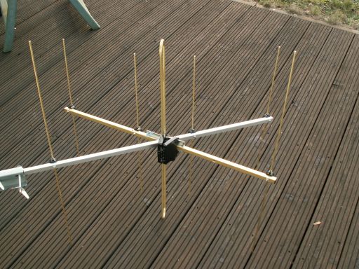 Entstanden sind 2(!) vertikale im stumpfen Winkel (ca.130°) gekreutzte 4-Element-Breitband-Antennen (nach Spindler Antennen) mit einem gemeinsamen Dipol im Kreuzungspunkt.
