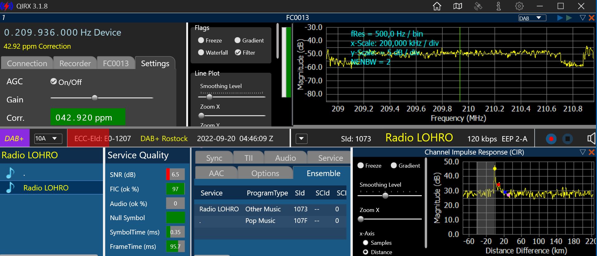 Slideshow sehe ich keine im DAB Player aber Qirks laedt irgendwas: Ensemble 0x1207, Label: 'DAB+ Rostock', ShortLabel: 'Rostock', LTO: +120 min, ECC: 0xE0, NumServices: 2 Audio-Service 0x1073, Label: 'Radio LOHRO', ShortLabel: 'LOHRO', PTY: Other Music (dynamic), AnnouncementSupport: No, NumComponents: 1 (Audio: 1, Data: 0) AudioComponent, SCIdS: 0, Label: '', ShortLabel: '', ASCTy: 0x3F (AAC), SubChId: 1, StartCU: 0, NumCU: 120, ErrorProt: EEP 2-A (FEC: 3/8), Datarate: 120 kbit/s, NumUserApps: 0 Audio-Service 0x107F, Label: '.', ShortLabel: '.', PTY: Pop Music (dynamic), AnnouncementSupport: No, NumComponents: 1 (Audio: 1, Data: 0) AudioComponent, SCIdS: 0, Label: '', ShortLabel: '', ASCTy: 0x3F (AAC), SubChId: 2, StartCU: 120, NumCU: 120, ErrorProt: EEP 2-A (FEC: 3/8), Datarate: 120 kbit/s, NumUserApps: 0