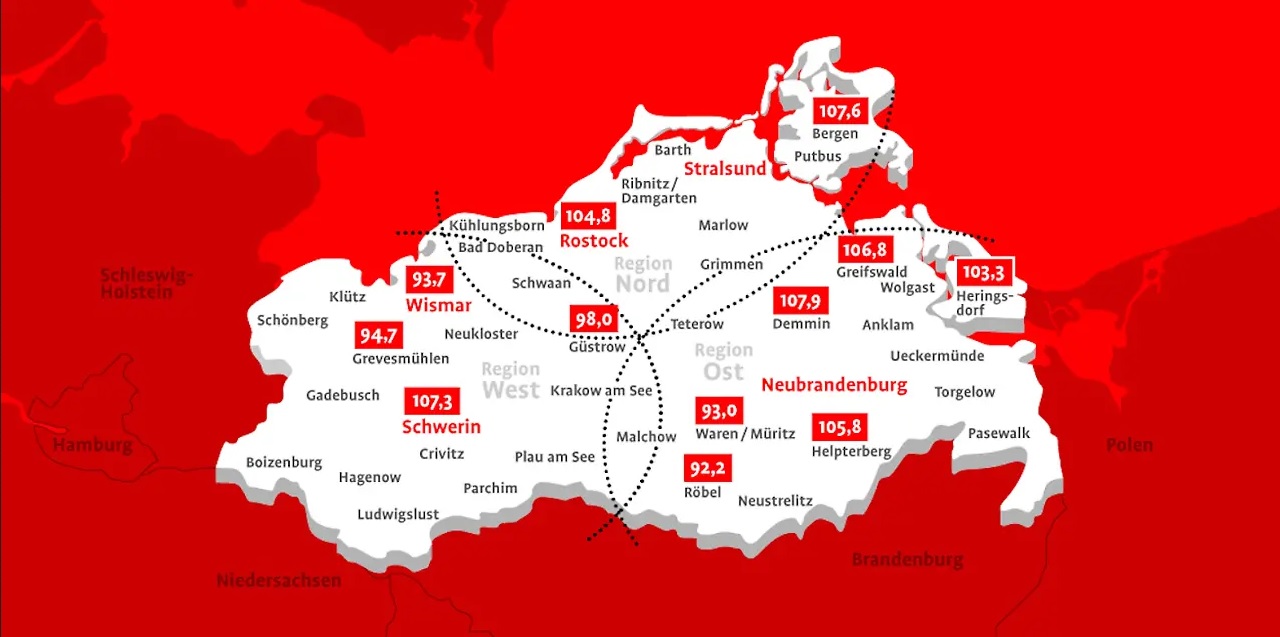 - MV Privat Regio: 11D SN-GÜ (MV West), 8D HRO-RÜG (MV NW), 10D NB (MV Süd), 8C HGW-PW (MV Ost)
