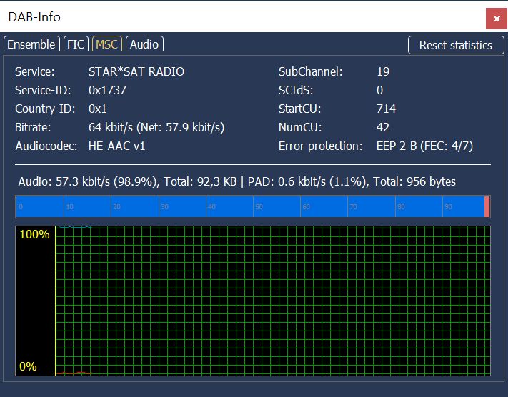 AudioComponent, SCIdS: 0, Label: '', ShortLabel: '', ASCTy: 0x3F (AAC), SubChId: 19, StartCU: 714, NumCU: 42, ErrorProt: EEP 2-B (FEC: 4/7), Datarate: 64 kbit/s, NumUserApps: 1