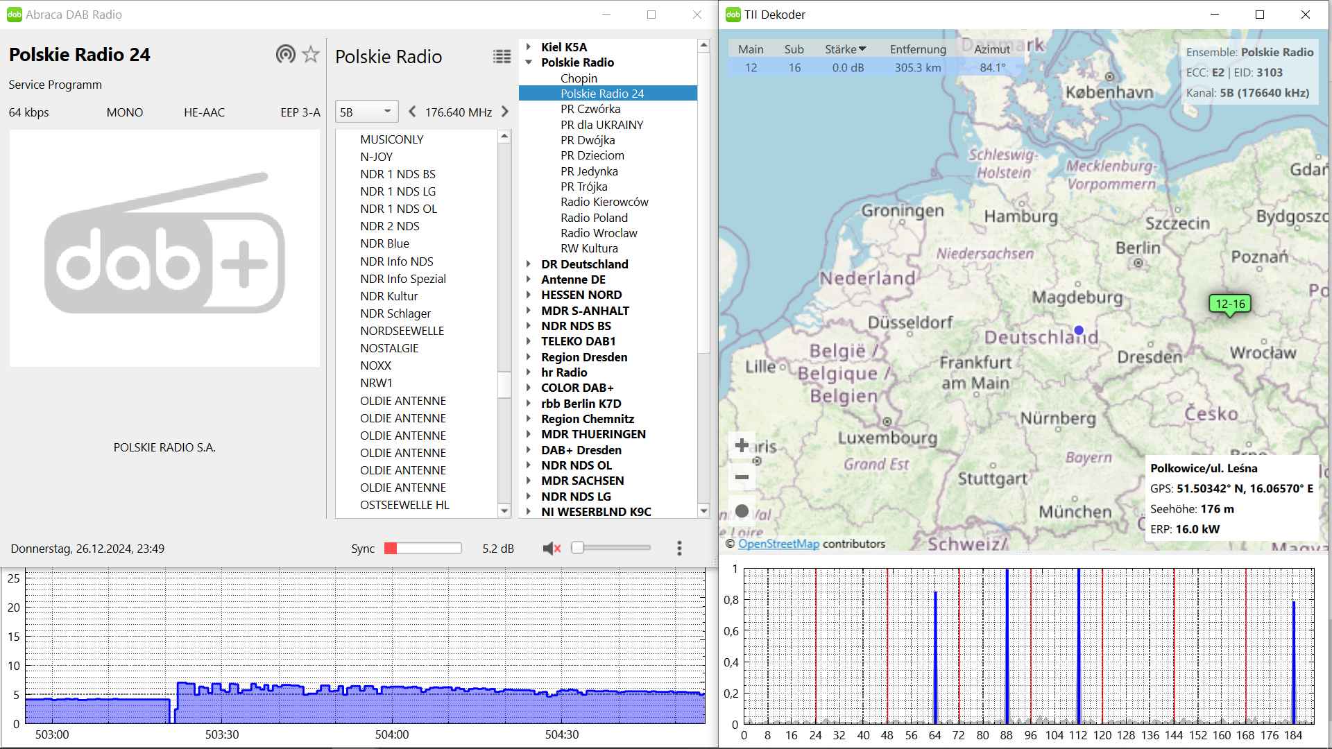 Ensemble: 0xC181 D1 National [ D1 Natl ] ECC: 0xE1, UTC 0 min, INT: 1, alarm announcements: 0 Services (26): 0xC0C0 talkSPORT [ tkSPORT ] ECC: 0xE1, Country: United Kingdom, PTy: Sport (static), Announcements: No AudioComponent (primary), SCIdS: 0, Label: 'talkSPORT' [ 'tkSPORT' ], ASCTy: 0x0 (MP2) SubChId: 2, Language: Unknown/NA, StartCU: 0, NumCU: 48, UEP #16, Protection level: 3, Bitrate: 64kbps 0xC0C2 LBC [ LBC ] ECC: 0xE1, Country: United Kingdom, PTy: Varied (static), Announcements: No AudioComponent (primary), SCIdS: 0, Label: 'LBC' [ 'LBC' ], ASCTy: 0x0 (MP2) SubChId: 15, Language: Unknown/NA, StartCU: 48, NumCU: 48, UEP #16, Protection level: 3, Bitrate: 64kbps 0xC0C6 Magic [ Magic ] ECC: 0xE1, Country: United Kingdom, PTy: Pop Music (static), Announcements: No AudioComponent (primary), SCIdS: 0, Label: 'Magic' [ 'Magic' ], ASCTy: 0x0 (MP2) SubChId: 11, Language: Unknown/NA, StartCU: 212, NumCU: 58, UEP #21, Protection level: 3, Bitrate: 80kbps 0xC1C0 Absolute Radio [ Absolute ] ECC: 0xE1, Country: United Kingdom, PTy: Rock Music (static), Announcements: No AudioComponent (primary), SCIdS: 0, Label: 'Absolute Radio' [ 'Absolute' ], ASCTy: 0x0 (MP2) SubChId: 3, Language: Unknown/NA, StartCU: 96, NumCU: 58, UEP #21, Protection level: 3, Bitrate: 80kbps 0xC1DC Heart 80s [ Heart80s ] ECC: 0xE1, Country: United Kingdom, PTy: Pop Music (static), Announcements: No AudioComponent (primary), SCIdS: 0, Label: 'Heart 80s' [ 'Heart80s' ], ASCTy: 0x3F (AAC) SubChId: 14, Language: Unknown/NA, StartCU: 442, NumCU: 24, EEP 3-A, Coderate: 1/2, Bitrate: 32kbps 0xC2A1 Classic FM [ Classic ] ECC: 0xE1, Country: United Kingdom, PTy: Light Classical (static), Announcements: No AudioComponent (primary), SCIdS: 0, Label: 'Classic FM' [ 'Classic' ], ASCTy: 0x3F (AAC) SubChId: 28, Language: Unknown/NA, StartCU: 766, NumCU: 48, EEP 3-A, Coderate: 1/2, Bitrate: 64kbps 0xC37B Capital XTRA [ Cap XTRA ] ECC: 0xE1, Country: United Kingdom, PTy: Pop Music (static), Announcements: No AudioComponent (primary), SCIdS: 0, Label: 'Capital XTRA' [ 'Cap XTRA' ], ASCTy: 0x3F (AAC) SubChId: 16, Language: Unknown/NA, StartCU: 490, NumCU: 30, EEP 3-A, Coderate: 1/2, Bitrate: 40kbps 0xC4CA UCB 1 [ UCB 1 ] ECC: 0xE1, Country: United Kingdom, PTy: Religion (static), Announcements: No AudioComponent (primary), SCIdS: 0, Label: 'UCB 1' [ 'UCB 1' ], ASCTy: 0x3F (AAC) SubChId: 7, Language: Unknown/NA, StartCU: 682, NumCU: 18, EEP 3-A, Coderate: 1/2, Bitrate: 24kbps 0xC4CD Radio X [ Radio X ] ECC: 0xE1, Country: United Kingdom, PTy: Rock Music (static), Announcements: No AudioComponent (primary), SCIdS: 0, Label: 'Radio X' [ 'Radio X' ], ASCTy: 0x3F (AAC) SubChId: 17, Language: Unknown/NA, StartCU: 544, NumCU: 30, EEP 3-A, Coderate: 1/2, Bitrate: 40kbps 0xC4ED Heart Xmas [ HeartXms ] ECC: 0xE1, Country: United Kingdom, PTy: Pop Music (static), Announcements: No AudioComponent (primary), SCIdS: 0, Label: 'Heart Xmas' [ 'HeartXms' ], ASCTy: 0x3F (AAC) SubChId: 25, Language: Unknown/NA, StartCU: 838, NumCU: 24, EEP 3-A, Coderate: 1/2, Bitrate: 32kbps 0xC4F0 GB News Radio [ GB News ] ECC: 0xE1, Country: United Kingdom, PTy: News (static), Announcements: No AudioComponent (primary), SCIdS: 0, Label: 'GB News Radio' [ 'GB News' ], ASCTy: 0x3F (AAC) SubChId: 24, Language: Unknown/NA, StartCU: 700, NumCU: 18, EEP 3-A, Coderate: 1/2, Bitrate: 24kbps 0xC4FB Smooth Relax [ Smth Rlx ] ECC: 0xE1, Country: United Kingdom, PTy: Easy Listening Music (static), Announcements: No AudioComponent (primary), SCIdS: 0, Label: 'Smooth Relax' [ 'Smth Rlx' ], ASCTy: 0x3F (AAC) SubChId: 27, Language: Unknown/NA, StartCU: 814, NumCU: 24, EEP 3-A, Coderate: 1/2, Bitrate: 32kbps 0xC5C0 KISS [ KISS ] ECC: 0xE1, Country: United Kingdom, PTy: Pop Music (static), Announcements: No AudioComponent (primary), SCIdS: 0, Label: 'KISS' [ 'KISS' ], ASCTy: 0x0 (MP2) SubChId: 10, Language: Unknown/NA, StartCU: 154, NumCU: 58, UEP #21, Protection level: 3, Bitrate: 80kbps 0xC5DA Capital UK [ Cap UK ] ECC: 0xE1, Country: United Kingdom, PTy: Pop Music (static), Announcements: No AudioComponent (primary), SCIdS: 0, Label: 'Capital UK' [ 'Cap UK' ], ASCTy: 0x3F (AAC) SubChId: 22, Language: Unknown/NA, StartCU: 598, NumCU: 30, EEP 3-A, Coderate: 1/2, Bitrate: 40kbps 0xC6C0 Smooth UK [ Smooth ] ECC: 0xE1, Country: United Kingdom, PTy: Easy Listening Music (static), Announcements: No AudioComponent (primary), SCIdS: 0, Label: 'Smooth UK' [ 'Smooth' ], ASCTy: 0x3F (AAC) SubChId: 6, Language: Unknown/NA, StartCU: 358, NumCU: 30, EEP 3-A, Coderate: 1/2, Bitrate: 40kbps 0xC8EA LBC News [ LBC News ] ECC: 0xE1, Country: United Kingdom, PTy: News (static), Announcements: No AudioComponent (primary), SCIdS: 0, Label: 'LBC News' [ 'LBC News' ], ASCTy: 0x3F (AAC) SubChId: 21, Language: Unknown/NA, StartCU: 574, NumCU: 24, EEP 3-A, Coderate: 1/2, Bitrate: 32kbps 0xC9EB Smooth Chill [ Chill ] ECC: 0xE1, Country: United Kingdom, PTy: Other Music (static), Announcements: No AudioComponent (primary), SCIdS: 0, Label: 'Smooth Chill' [ 'Chill' ], ASCTy: 0x3F (AAC) SubChId: 12, Language: Unknown/NA, StartCU: 628, NumCU: 24, EEP 3-A, Coderate: 1/2, Bitrate: 32kbps 0xC9ED Capital DANCE [ Cap DNCE ] ECC: 0xE1, Country: United Kingdom, PTy: Pop Music (static), Announcements: No AudioComponent (primary), SCIdS: 0, Label: 'Capital DANCE' [ 'Cap DNCE' ], ASCTy: 0x3F (AAC) SubChId: 23, Language: Unknown/NA, StartCU: 652, NumCU: 30, EEP 3-A, Coderate: 1/2, Bitrate: 40kbps 0xC9F3 Heart 00s [ Heart00s ] ECC: 0xE1, Country: United Kingdom, PTy: Pop Music (static), Announcements: No AudioComponent (primary), SCIdS: 0, Label: 'Heart 00s' [ 'Heart00s' ], ASCTy: 0x3F (AAC) SubChId: 20, Language: Unknown/NA, StartCU: 742, NumCU: 24, EEP 3-A, Coderate: 1/2, Bitrate: 32kbps 0xCAE9 Heart 70s [ Heart70s ] ECC: 0xE1, Country: United Kingdom, PTy: Pop Music (static), Announcements: No AudioComponent (primary), SCIdS: 0, Label: 'Heart 70s' [ 'Heart70s' ], ASCTy: 0x3F (AAC) SubChId: 19, Language: Unknown/NA, StartCU: 52