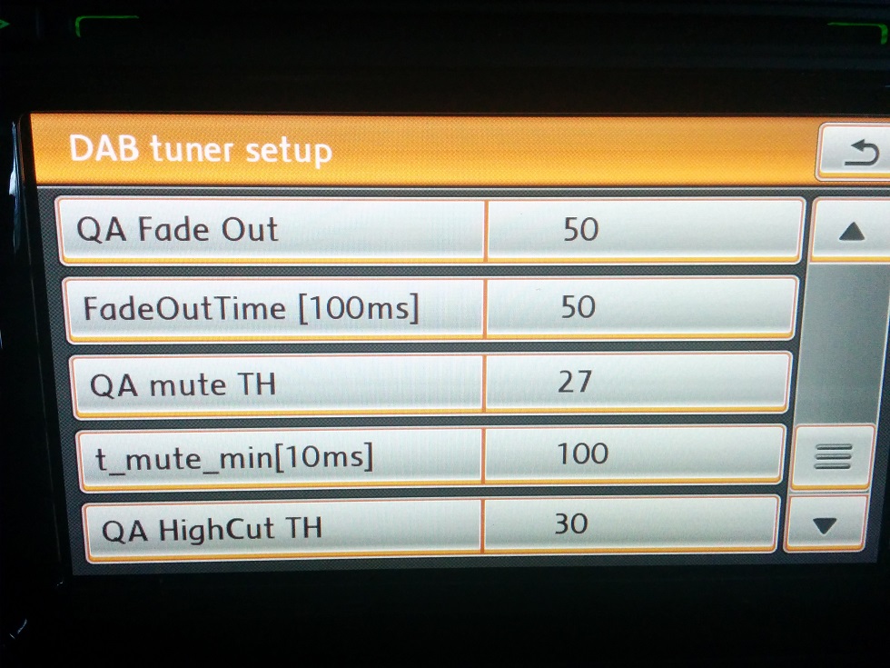 Ach wie ist das schön. Heute habe ich ein noch geheimeres Menü als das geheime Menü gefunden. Dieser öde nichtssagende Empfangsbalken vom "Servicemenü" wird nun abgelöst durch unzählige Anzeigen von dB bis alles mögliche. Jeder Wert ist beliebig einstellbar, ab wann bei welchem Signal wie lange stumm geschaltet wird, bei welcher Stärke auf FM umgeschaltet wird und wann zurück und so weiter. Da kann man Stunden verbringen mit testen. Ebenfalls für UKW und AM, was ich nicht testete da ja DAB Vorrang hat. Macht euch ein Bild, eventuell Vorschläge für die Abkürzungen und was man mit welchen Menüpunkten einstellen könnte.