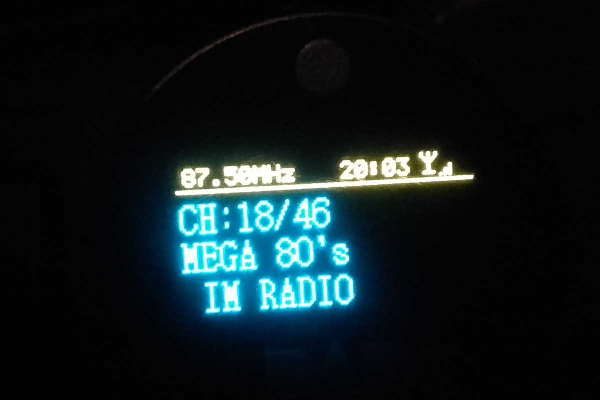 In der ersten Zeile wird die verwendete UKW-Frequenz angezeigt, die Uhrzeit, sowie die DAB-Signalstärke. Bei Anschluss eines Klinkenkabels auch noch ein kleiner Kopfhöhrer.