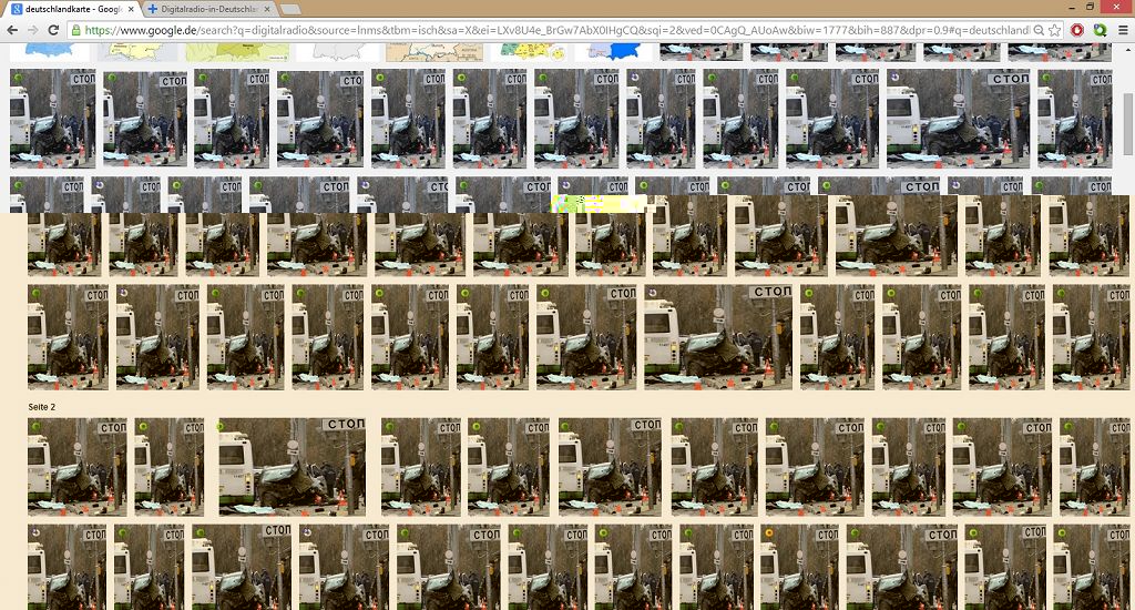 Seit heute tritt (offensichtlich nur bei Kabel BW Kunden) bei Google Bilder der Fehler auf, dass ab dem ca. 20 Bild nur noch Bilder eines russischen Verkehrsunfalls kommen (mit einem russischen Stoppschild CTOП). Auf meinem Smartphone ist sogar bereits das erste Bild vom Verkehrsunfall. Hier hat schon einer mit Kabel BW bzgl. des Problems telefoniert (