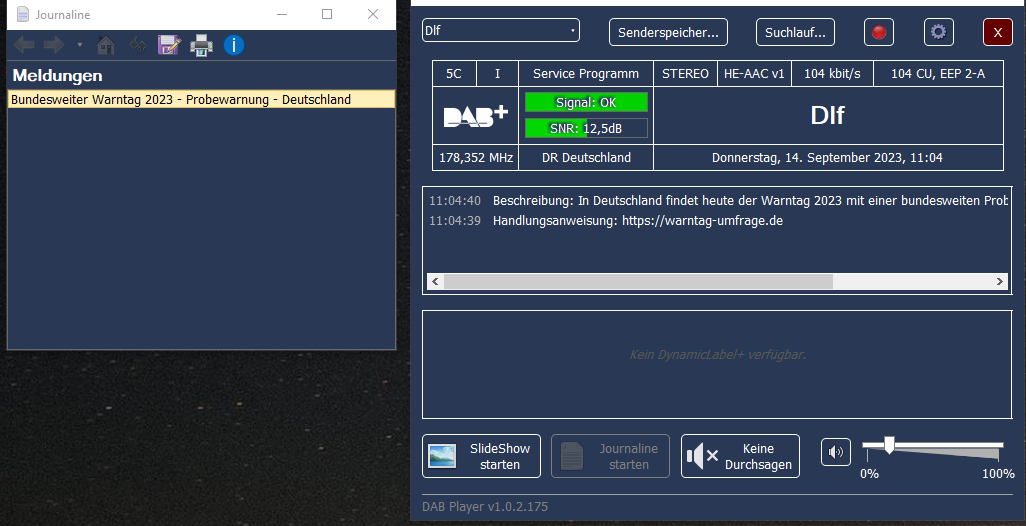 Was mich aber gewundert hat, ich hatte wie immer den DAB Player an und auch extra auf den BM1 gestellt. Nach dem meeting zurück zum Schreibtisch, und dort stand kein Hinweis im Bildschirm das es irgend eine Warnung gegeben hat. Denke sowas sollte statisch erhalten bleiben bis man den Sender wechselt oder das irgendwie quittiert. Man hat ja nicht immer sein ganzes Gelump um sich - z.B. wenn man auf den Eimer geht.
