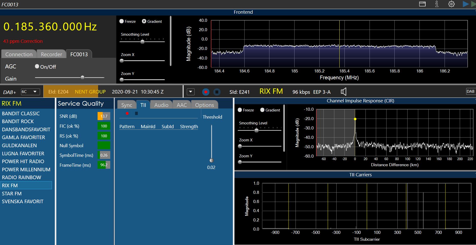 Ensemble 0xE303, Label: 'BAUER MEDIA MLM', ShortLabel: 'BAUER', LTO: 0 min, ECC: 0xE3, NumServices: 8 Audio-Service 0xE220, Label: 'NRJ', ShortLabel: 'NRJ', PTY: Pop Music (dynamic), AnnouncementSupport: No, NumComponents: 1 (Audio: 1, Data: 0) AudioComponent, SCIdS: 0, Label: '', ShortLabel: '', ASCTy: 0x3F (AAC), SubChId: 1, StartCU: 96, NumCU: 96, ErrorProt: EEP 3-A (FEC: 1/2), Datarate: 128 kbit/s, NumUserApps: 1 User App 1 / 1, Label: '', ShortLabel: '', DSCTy: 0x3C (MOT), X-PAD type: 12, UaType: 0x2 (Slideshow), DataLen: 2 [0C3C] Audio-Service 0xE243, Label: 'MIX MEGAPOL', ShortLabel: 'MEGAPOL', PTY: Pop Music (dynamic), AnnouncementSupport: No, NumComponents: 1 (Audio: 1, Data: 0) AudioComponent, SCIdS: 0, Label: '', ShortLabel: '', ASCTy: 0x3F (AAC), SubChId: 7, StartCU: 0, NumCU: 96, ErrorProt: EEP 3-A (FEC: 1/2), Datarate: 128 kbit/s, NumUserApps: 1 User App 1 / 1, Label: '', ShortLabel: '', DSCTy: 0x3C (MOT), X-PAD type: 12, UaType: 0x2 (Slideshow), DataLen: 2 [0C3C] Audio-Service 0xE2A0, Label: 'ROCKKLASSIKER', ShortLabel: 'ROCKKLAS', PTY: Rock Music (dynamic), AnnouncementSupport: No, NumComponents: 1 (Audio: 1, Data: 0) AudioComponent, SCIdS: 0, Label: '', ShortLabel: '', ASCTy: 0x3F (AAC), SubChId: 2, StartCU: 192, NumCU: 96, ErrorProt: EEP 3-A (FEC: 1/2), Datarate: 128 kbit/s, NumUserApps: 1 User App 1 / 1, Label: '', ShortLabel: '', DSCTy: 0x3C (MOT), X-PAD type: 12, UaType: 0x2 (Slideshow), DataLen: 2 [0C3C] Audio-Service 0xE2A2, Label: 'HÅRDROCK', ShortLabel: 'HÅRDROCK', PTY: Rock Music (dynamic), AnnouncementSupport: No, NumComponents: 1 (Audio: 1, Data: 0) AudioComponent, SCIdS: 0, Label: '', ShortLabel: '', ASCTy: 0x3F (AAC), SubChId: 3, StartCU: 288, NumCU: 96, ErrorProt: EEP 3-A (FEC: 1/2), Datarate: 128 kbit/s, NumUserApps: 1 User App 1 / 1, Label: '', ShortLabel: '', DSCTy: 0x3C (MOT), X-PAD type: 12, UaType: 0x2 (Slideshow), DataLen: 2 [0C3C] Audio-Service 0xE2A6, Label: 'LUGNA KLASSIKER', ShortLabel: 'LUGNAKLA', PTY: Easy Listening Music (dynamic), AnnouncementSupport: No, NumComponents: 1 (Audio: 1, Data: 0) AudioComponent, SCIdS: 0, Label: '', ShortLabel: '', ASCTy: 0x3F (AAC), SubChId: 4, StartCU: 384, NumCU: 96, ErrorProt: EEP 3-A (FEC: 1/2), Datarate: 128 kbit/s, NumUserApps: 1 User App 1 / 1, Label: '', ShortLabel: '', DSCTy: 0x3C (MOT), X-PAD type: 12, UaType: 0x2 (Slideshow), DataLen: 2 [0C3C] Audio-Service 0xE2A8, Label: 'VINYL FM', ShortLabel: 'VINYL FM', PTY: Pop Music (dynamic), AnnouncementSupport: No, NumComponents: 1 (Audio: 1, Data: 0) AudioComponent, SCIdS: 0, Label: '', ShortLabel: '', ASCTy: 0x3F (AAC), SubChId: 5, StartCU: 480, NumCU: 96, ErrorProt: EEP 3-A (FEC: 1/2), Datarate: 128 kbit/s, NumUserApps: 1 User App 1 / 1, Label: '', ShortLabel: '', DSCTy: 0x3C (MOT), X-PAD type: 12, UaType: 0x2 (Slideshow), DataLen: 2 [0C3C] Audio-Service 0xE2A9, Label: 'SVENSK POP', ShortLabel: 'SVE POP', PTY: Pop Music (dynamic), AnnouncementSupport: No, NumComponents: 1 (Audio: 1, Data: 0) AudioComponent, SCIdS: 0, Label: '', ShortLabel: '', ASCTy: 0x3F (AAC), SubChId: 6, StartCU: 576, NumCU: 96, ErrorProt: EEP 3-A (FEC: 1/2), Datarate: 128 kbit/s, NumUserApps: 1 User App 1 / 1, Label: '', ShortLabel: '', DSCTy: 0x3C (MOT), X-PAD type: 12, UaType: 0x2 (Slideshow), DataLen: 2 [0C3C] Audio-Service 0xE2F1, Label: 'NOSTALGI', ShortLabel: 'NOSTALGI', PTY: Easy Listening Music (dynamic), AnnouncementSupport: No, NumComponents: 1 (Audio: 1, Data: 0) AudioComponent, SCIdS: 0, Label: '', ShortLabel: '', ASCTy: 0x3F (AAC), SubChId: 8, StartCU: 672, NumCU: 96, ErrorProt: EEP 3-A (FEC: 1/2), Datarate: 128 kbit/s, NumUserApps: 1 User App 1 / 1, Label: '', ShortLabel: '', DSCTy: 0x3C (MOT), X-PAD type: 12, UaType: 0x2 (Slideshow), DataLen: 2 [0C3C]