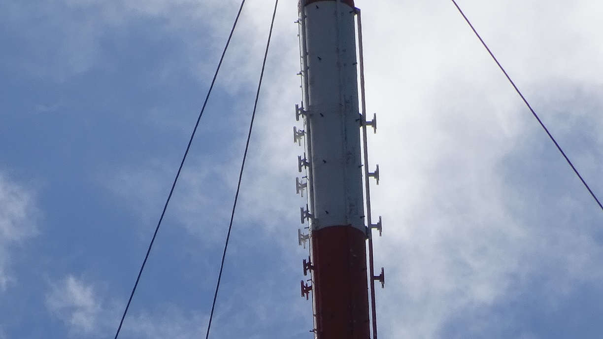 Auf Senderfotos-bb.de sieht man auch den horizontalen Blitzableiter im unteren Bereich des GFK, hinter dem sich die vertikale DAB Antenne befindet.