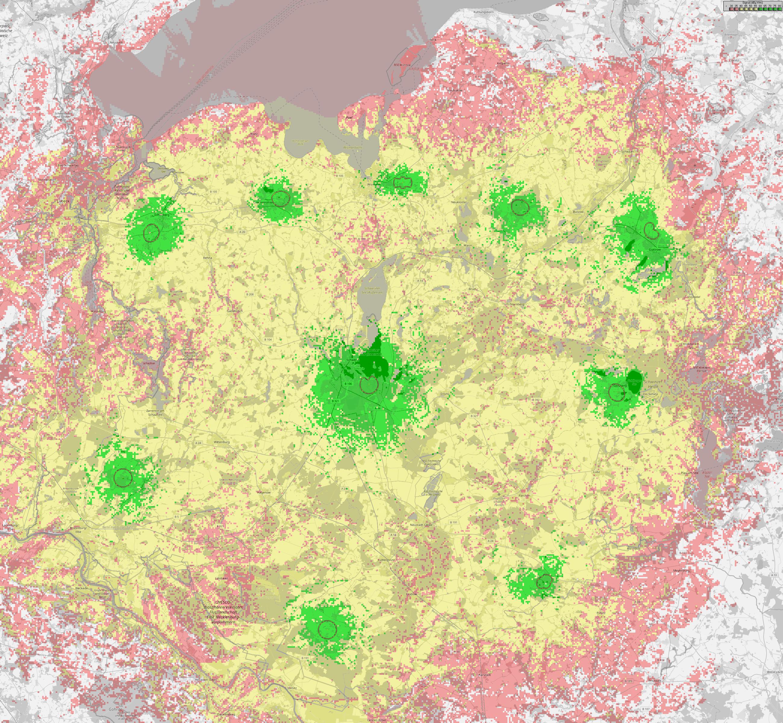 Grundsätzlich ist das Ergebnis nicht schlecht, nur wird auch schon viel Fläche außerhalb des vorgesehenen Gebiets versorgt, was nicht optimal ist. Außerdem bleibt die Versorgung im Bereich Goldberg eher mäßig. Der Bereich rund um Plau am See ist natürlich gut versorgt.