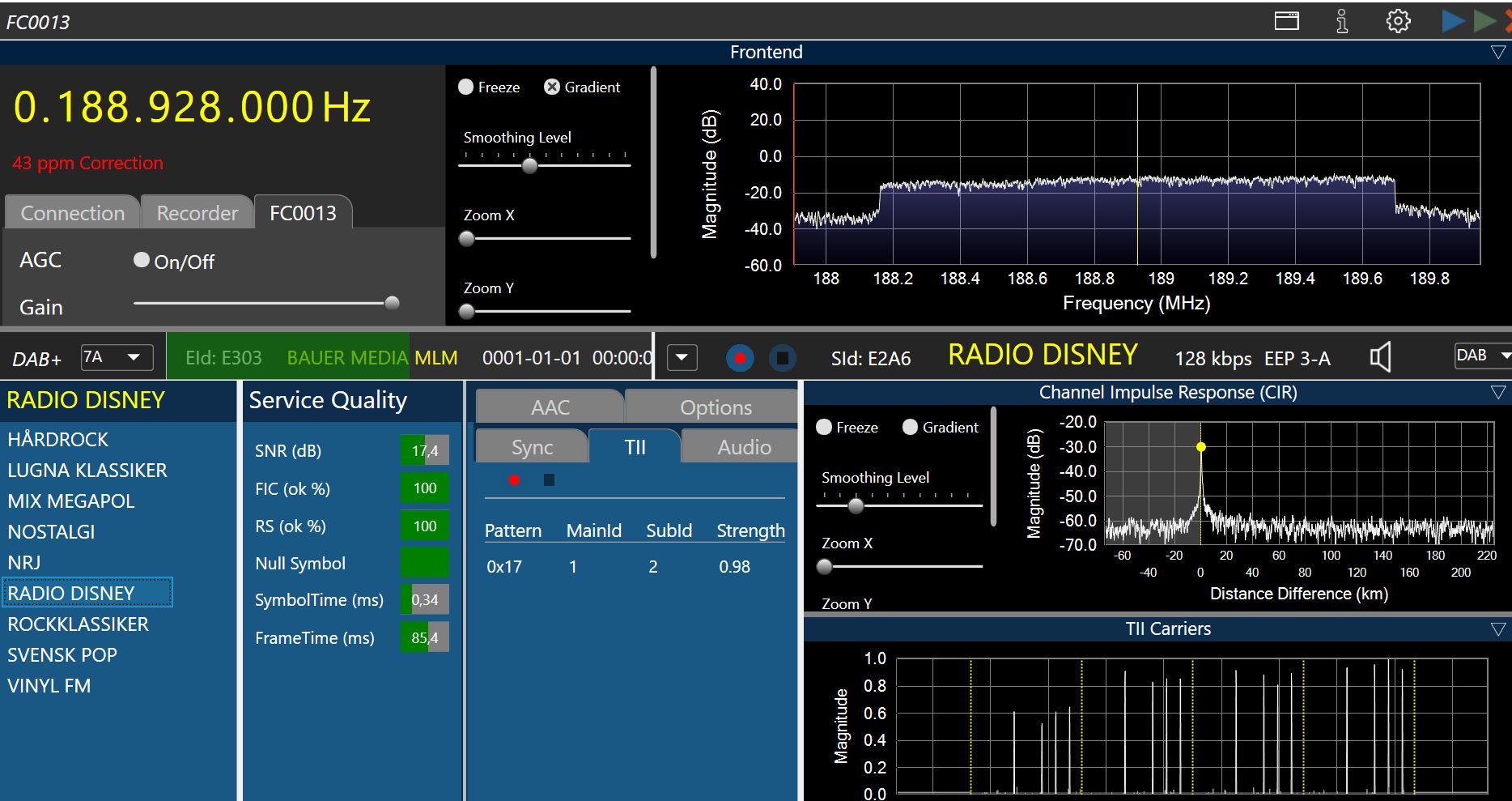 Aktuelle Konfiguration des 7C Malmoe: Ensemble 0xE205, Label: 'NENT GROUP', ShortLabel: 'NENT GRP', LTO: +60 min, ECC: 0xE3, NumServices: 14 Audio-Service 0xE241, Label: 'RIX FM', ShortLabel: 'RIX FM', PTY: Pop Music (dynamic), AnnouncementSupport: No, NumComponents: 1 (Audio: 1, Data: 0) AudioComponent, SCIdS: 0, Label: '', ShortLabel: '', ASCTy: 0x3F (AAC), SubChId: 1, StartCU: 0, NumCU: 72, ErrorProt: EEP 3-A (FEC: 1/2), Datarate: 96 kbit/s, NumUserApps: 1 User App 1 / 1, Label: '', ShortLabel: '', DSCTy: 0x3C (MOT), X-PAD type: 12, UaType: 0x2 (Slideshow), DataLen: 2 [0C3C] Audio-Service 0xE245, Label: 'STAR FM', ShortLabel: 'STAR FM', PTY: Pop Music (dynamic), AnnouncementSupport: No, NumComponents: 1 (Audio: 1, Data: 0) AudioComponent, SCIdS: 0, Label: '', ShortLabel: '', ASCTy: 0x3F (AAC), SubChId: 2, StartCU: 72, NumCU: 72, ErrorProt: EEP 3-A (FEC: 1/2), Datarate: 96 kbit/s, NumUserApps: 1 User App 1 / 1, Label: '', ShortLabel: '', DSCTy: 0x3C (MOT), X-PAD type: 12, UaType: 0x2 (Slideshow), DataLen: 2 [0C3C] Audio-Service 0xE251, Label: 'GAMLA FAVORITER', ShortLabel: 'GAMLA', PTY: Pop Music (dynamic), AnnouncementSupport: No, NumComponents: 1 (Audio: 1, Data: 0) AudioComponent, SCIdS: 0, Label: '', ShortLabel: '', ASCTy: 0x3F (AAC), SubChId: 6, StartCU: 348, NumCU: 60, ErrorProt: EEP 3-A (FEC: 1/2), Datarate: 80 kbit/s, NumUserApps: 1 User App 1 / 1, Label: '', ShortLabel: '', DSCTy: 0x3C (MOT), X-PAD type: 12, UaType: 0x2 (Slideshow), DataLen: 2 [0C3C] Audio-Service 0xE252, Label: 'BANDIT CLASSIC', ShortLabel: 'BANDIT C', PTY: Rock Music (dynamic), AnnouncementSupport: No, NumComponents: 1 (Audio: 1, Data: 0) AudioComponent, SCIdS: 0, Label: '', ShortLabel: '', ASCTy: 0x3F (AAC), SubChId: 7, StartCU: 408, NumCU: 60, ErrorProt: EEP 3-A (FEC: 1/2), Datarate: 80 kbit/s, NumUserApps: 1 User App 1 / 1, Label: '', ShortLabel: '', DSCTy: 0x3C (MOT), X-PAD type: 12, UaType: 0x2 (Slideshow), DataLen: 2 [0C3C] Audio-Service 0xE253, Label: 'GO COUNTRY', ShortLabel: 'COUNTRY', PTY: Country Music (dynamic), AnnouncementSupport: No, NumComponents: 1 (Audio: 1, Data: 0) AudioComponent, SCIdS: 0, Label: '', ShortLabel: '', ASCTy: 0x3F (AAC), SubChId: 8, StartCU: 468, NumCU: 60, ErrorProt: EEP 3-A (FEC: 1/2), Datarate: 80 kbit/s, NumUserApps: 1 User App 1 / 1, Label: '', ShortLabel: '', DSCTy: 0x3C (MOT), X-PAD type: 12, UaType: 0x2 (Slideshow), DataLen: 2 [0C3C] Audio-Service 0xE254, Label: 'RADIO RAINBOW', ShortLabel: 'RAINBOW', PTY: Pop Music (dynamic), AnnouncementSupport: No, NumComponents: 1 (Audio: 1, Data: 0) AudioComponent, SCIdS: 0, Label: '', ShortLabel: '', ASCTy: 0x3F (AAC), SubChId: 9, StartCU: 528, NumCU: 60, ErrorProt: EEP 3-A (FEC: 1/2), Datarate: 80 kbit/s, NumUserApps: 1 User App 1 / 1, Label: '', ShortLabel: '', DSCTy: 0x3C (MOT), X-PAD type: 12, UaType: 0x2 (Slideshow), DataLen: 2 [0C3C] Audio-Service 0xE255, Label: 'SVENSKA FAVORIT', ShortLabel: 'SVENSKA', PTY: Pop Music (dynamic), AnnouncementSupport: No, NumComponents: 1 (Audio: 1, Data: 0) AudioComponent, SCIdS: 0, Label: '', ShortLabel: '', ASCTy: 0x3F (AAC), SubChId: 10, StartCU: 588, NumCU: 60, ErrorProt: EEP 3-A (FEC: 1/2), Datarate: 80 kbit/s, NumUserApps: 1 User App 1 / 1, Label: '', ShortLabel: '', DSCTy: 0x3C (MOT), X-PAD type: 12, UaType: 0x2 (Slideshow), DataLen: 2 [0C3C] Audio-Service 0xE256, Label: 'RIX FM FRESH', ShortLabel: 'RIXFRESH', PTY: Pop Music (dynamic), AnnouncementSupport: No, NumComponents: 1 (Audio: 1, Data: 0) AudioComponent, SCIdS: 0, Label: '', ShortLabel: '', ASCTy: 0x3F (AAC), SubChId: 11, StartCU: 648, NumCU: 60, ErrorProt: EEP 3-A (FEC: 1/2), Datarate: 80 kbit/s, NumUserApps: 1 User App 1 / 1, Label: '', ShortLabel: '', DSCTy: 0x3C (MOT), X-PAD type: 12, UaType: 0x2 (Slideshow), DataLen: 2 [0C3C] Audio-Service 0xE2A7, Label: 'BANDIT ROCK', ShortLabel: 'BANDIT', PTY: Rock Music (dynamic), AnnouncementSupport: No, NumComponents: 1 (Audio: 1, Data: 0) AudioComponent, SCIdS: 0, Label: '', ShortLabel: '', ASCTy: 0x3F (AAC), SubChId: 3, StartCU: 144, NumCU: 72, ErrorProt: EEP 3-A (FEC: 1/2), Datarate: 96 kbit/s, NumUserApps: 1 User App 1 / 1, Label: '', ShortLabel: '', DSCTy: 0x3C (MOT), X-PAD type: 12, UaType: 0x2 (Slideshow), DataLen: 2 [0C3C] Audio-Service 0xE378, Label: 'GULDKANALEN', ShortLabel: 'GULD', PTY: -, AnnouncementSupport: No, NumComponents: 1 (Audio: 1, Data: 0) AudioComponent, SCIdS: 0, Label: '', ShortLabel: '', ASCTy: 0x3F (AAC), SubChId: 12, StartCU: 708, NumCU: 60, ErrorProt: EEP 3-A (FEC: 1/2), Datarate: 80 kbit/s, NumUserApps: 1 User App 1 / 1, Label: '', ShortLabel: '', DSCTy: 0x3C (MOT), X-PAD type: 12, UaType: 0x2 (Slideshow), DataLen: 2 [0C3C] Audio-Service 0xE379, Label: 'DANSBANDSKANALEN', ShortLabel: 'DANSBAND', PTY: -, AnnouncementSupport: No, NumComponents: 1 (Audio: 1, Data: 0) AudioComponent, SCIdS: 0, Label: '', ShortLabel: '', ASCTy: 0x3F (AAC), SubChId: 14, StartCU: 768, NumCU: 60, ErrorProt: EEP 3-A (FEC: 1/2), Datarate: 80 kbit/s, NumUserApps: 1 User App 1 / 1, Label: '', ShortLabel: '', DSCTy: 0x3C (MOT), X-PAD type: 12, UaType: 0x2 (Slideshow), DataLen: 2 [0C3C] Audio-Service 0xE444, Label: 'LUGNA FAVORITER', ShortLabel: 'LUGNA', PTY: Pop Music (dynamic), AnnouncementSupport: No, NumComponents: 1 (Audio: 1, Data: 0) AudioComponent, SCIdS: 0, Label: '', ShortLabel: '', ASCTy: 0x3F (AAC), SubChId: 4, StartCU: 216, NumCU: 72, ErrorProt: EEP 3-A (FEC: 1/2), Datarate: 96 kbit/s, NumUserApps: 1 User App 1 / 1, Label: '', ShortLabel: '', DSCTy: 0x3C (MOT), X-PAD type: 12, UaType: 0x2 (Slideshow), DataLen: 2 [0C3C] Audio-Service 0xE4A4, Label: 'POWER', ShortLabel: 'POWER', PTY: Pop Music (dynamic), AnnouncementSupport: No, NumComponents: 1 (Audio: 1, Data: 0) AudioComponent, SCIdS: 0, Label: '', ShortLabel: '', ASCTy: 0x3F (AAC), SubChId: 5, StartCU: 288, NumCU: 60, ErrorProt: EEP 3-A (FEC: 1/2), Datarate: 80 kbit/s, NumUserApps: 1 User App 1 / 1, Label: '', ShortLabel: '', DSCTy: 0x3C (MOT), X-PAD type: 12, UaType: 0x2 (Slideshow), DataLen: 2 [0C3C] Data-Service 