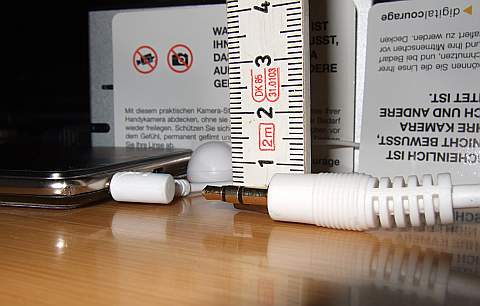 Da die Kopfhörerbuchse näher an die abnehmbare Rückseite im Stylus eingebaut ist, ragen viele Klinkenstecker meist unten über den gerundeten Kunstoffrand hinaus. Dies sieht man an den weißen 0,3 mm Karton, der an den dünneren Stecker des