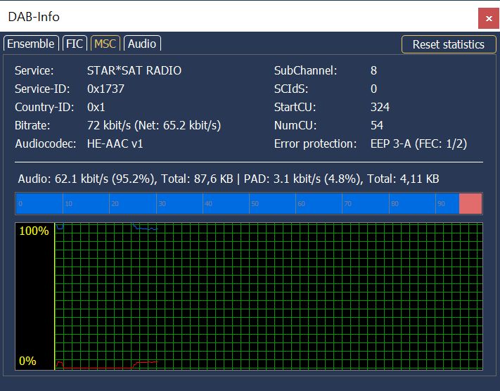 AudioComponent, SCIdS: 0, Label: '', ShortLabel: '', ASCTy: 0x3F (AAC), SubChId: 2, StartCU: 54, NumCU: 54, ErrorProt: EEP 3-A (FEC: 1/2), Datarate: 72 kbit/s, NumUserApps: 1