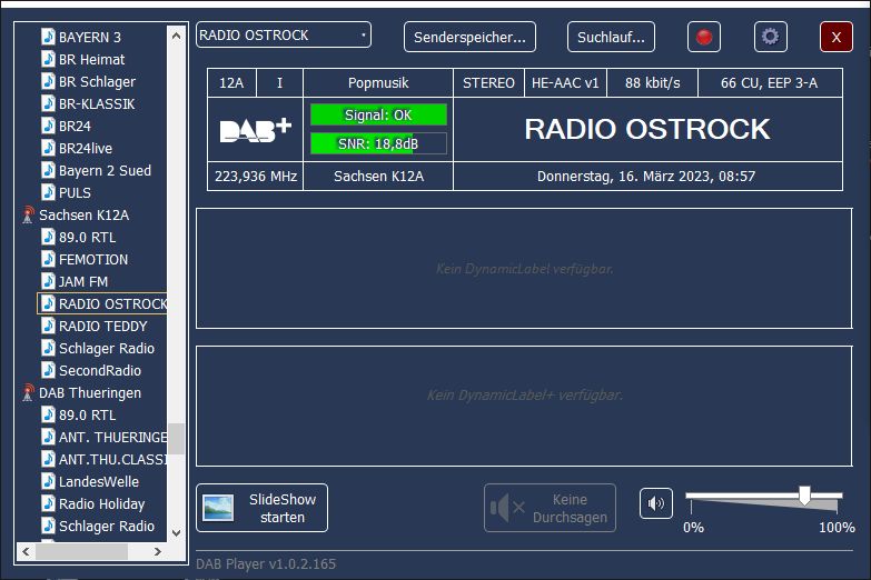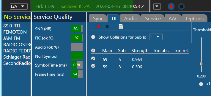 Ensemble 0x1139, Label: 'Sachsen K12A', ShortLabel: 'Sn K12A', LTO: +60 min, ECC: 0xE0, AlarmFlag: 0, NumServices: 7 Audio-Service 0x10B2, Label: 'JAM FM', ShortLabel: 'JAM FM', PTY: Pop Music (dynamic), AnnouncementSupport: No, NumComponents: 1 (Audio: 1, Data: 0) AudioComponent, SCIdS: 0, Label: '', ShortLabel: '', ASCTy: 0x3F (AAC), SubChId: 10, StartCU: 324, NumCU: 72, ErrorProt: EEP 3-A (FEC: 1/2), Datarate: 96 kbit/s, NumUserApps: 1 User App 1 / 1, Label: '', ShortLabel: '', DSCTy: 0x3C (MOT), X-PAD type: 12, UaType: 0x2 (Slideshow), DataLen: 2 [0C3C] Audio-Service 0x10C2, Label: 'SecondRadio', ShortLabel: 'SR', PTY: Pop Music (dynamic), AnnouncementSupport: No, NumComponents: 1 (Audio: 1, Data: 0) AudioComponent, SCIdS: 0, Label: '', ShortLabel: '', ASCTy: 0x3F (AAC), SubChId: 8, StartCU: 192, NumCU: 66, ErrorProt: EEP 3-A (FEC: 1/2), Datarate: 88 kbit/s, NumUserApps: 1 User App 1 / 1, Label: '', ShortLabel: '', DSCTy: 0x3C (MOT), X-PAD type: 12, UaType: 0x2 (Slideshow), DataLen: 2 [0C3C] Audio-Service 0x12C9, Label: 'FEMOTION', ShortLabel: 'FEMOTION', PTY: Pop Music (dynamic), AnnouncementSupport: No, NumComponents: 1 (Audio: 1, Data: 0) AudioComponent, SCIdS: 0, Label: '', ShortLabel: '', ASCTy: 0x3F (AAC), SubChId: 11, StartCU: 396, NumCU: 60, ErrorProt: EEP 3-A (FEC: 1/2), Datarate: 80 kbit/s, NumUserApps: 1 User App 1 / 1, Label: '', ShortLabel: '', DSCTy: 0x3C (MOT), X-PAD type: 12, UaType: 0x2 (Slideshow), DataLen: 2 [0C3C] Audio-Service 0x1735, Label: 'Schlager Radio', ShortLabel: 'Schlager', PTY: Pop Music (dynamic), AnnouncementSupport: No, NumComponents: 1 (Audio: 1, Data: 0) AudioComponent, SCIdS: 0, Label: '', ShortLabel: '', ASCTy: 0x3F (AAC), SubChId: 5, StartCU: 72, NumCU: 60, ErrorProt: EEP 3-A (FEC: 1/2), Datarate: 80 kbit/s, NumUserApps: 1 User App 1 / 1, Label: '', ShortLabel: '', DSCTy: 0x3C (MOT), X-PAD type: 12, UaType: 0x2 (Slideshow), DataLen: 2 [0C3C] Audio-Service 0x1B2E, Label: 'RADIO TEDDY', ShortLabel: 'TEDDY', PTY: Children's programmes (dynamic), AnnouncementSupport: No, NumComponents: 1 (Audio: 1, Data: 0) AudioComponent, SCIdS: 0, Label: '', ShortLabel: '', ASCTy: 0x3F (AAC), SubChId: 6, StartCU: 132, NumCU: 60, ErrorProt: EEP 3-A (FEC: 1/2), Datarate: 80 kbit/s, NumUserApps: 1 User App 1 / 1, Label: '', ShortLabel: '', DSCTy: 0x3C (MOT), X-PAD type: 12, UaType: 0x2 (Slideshow), DataLen: 2 [0C3C] Audio-Service 0x1EC1, Label: 'RADIO OSTROCK', ShortLabel: 'OSTROCK', PTY: Pop Music (dynamic), AnnouncementSupport: No, NumComponents: 1 (Audio: 1, Data: 0) AudioComponent, SCIdS: 0, Label: '', ShortLabel: '', ASCTy: 0x3F (AAC), SubChId: 9, StartCU: 258, NumCU: 66, ErrorProt: EEP 3-A (FEC: 1/2), Datarate: 88 kbit/s, NumUserApps: 1 User App 1 / 1, Label: '', ShortLabel: '', DSCTy: 0x3C (MOT), X-PAD type: 12, UaType: 0x2 (Slideshow), DataLen: 2 [0C3C] Audio-Service 0xD0DB, Label: '89.0 RTL', ShortLabel: '89.0 RTL', PTY: Pop Music (dynamic), AnnouncementSupport: No, NumComponents: 1 (Audio: 1, Data: 0) AudioComponent, SCIdS: 0, Label: '', ShortLabel: '', ASCTy: 0x3F (AAC), SubChId: 1, StartCU: 0, NumCU: 72, ErrorProt: EEP 3-A (FEC: 1/2), Datarate: 96 kbit/s, NumUserApps: 1 User App 1 / 1, Label: '', ShortLabel: '', DSCTy: 0x3C (MOT), X-PAD type: 12, UaType: 0x2 (Slideshow), DataLen: 2 [0C3C]
