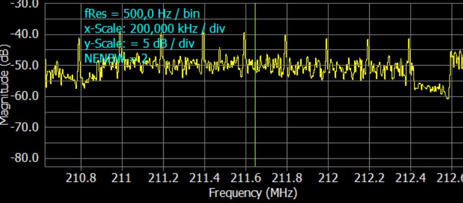 Anbei nun mein Nachbarstoerer der immer tagsueber von 7 Uhr bis 19 Uhr ueber das gesamte VHF Band stoert. Internet Hausverteilung ueber Steckdosensystem. Macht mir den rbb 10B Casekow Empfang kaputt und reduziert das SNR beim 10C NDR um 6 dB. Zum Glueck kein Rauschen, sondern 'nur' schmale Spikes im 200kHz Abstand.