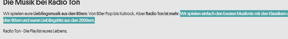 Radio TON hat binnen eines Jahres dank der Umstellung auf eine reine 80er-Playlist seine Hörerzahl nahezu halbiert, Respekt! :oops: vom ohnehin schon schwachen Wert 41.000 ging es runter auf 23.000 . in der Zielgruppe 14-49 ist mehr als die Hälfte der Hörer abgewandert , nur noch 9000 schalten dort ein. wen wunderts bei der alten Musik... wer heute 40 ist war Mitte des heute so gehypten Jahrzehnts 80er gerade mal im Kleinkindalter und hat keine Erinnerung an die damalige Musik.