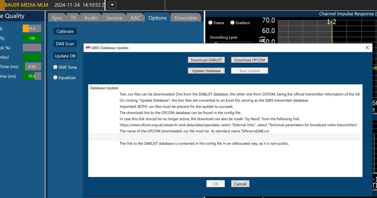 Wichtig zum DXen sind CIR und HF Spektrum. Nur damit kann man sehen wieviel Pegel anliegt und ob Stoerungen durch HF Stoerer, zu weit entfernte Standorte oder andere Multiplexe vorhanden sind. Auch zeigt beides schon an ob du was 'empfaengst' lange bevor ein Multiplex ueberhaupt eingelesen werden kann.