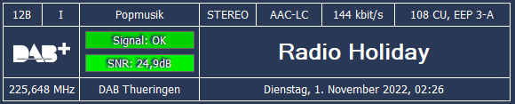 Radio Holiday wurde im Kanal 12B Thüringen aufgeschaltet. Außerdem erhöht Schlager Radio auf 96kBit aber schraubt den Fehlerschutz auf 2A herunter. Der Rest bleibt bei 3A und 144kBit. Das aktuell gesendete Logo wurde entsprechend im Slideshow Bilder Radio Holiday NRW hochgeladen. Gut möglich das man den Platz von Pure FM in Berlin heute auch noch einnimmt. Derzeit aber noch nicht. Dateianhang: