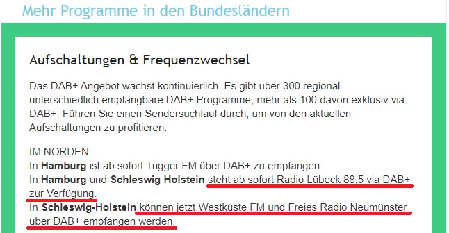 Aus MB-Kreisen habe ich jetzt das erfahren, was sich schon spekuliert hatte: Der Rückzug von Radio Lübeck aus DAB+ war wohl nicht so ganz freiwillig. Wohl versorglich, bevor - Zitat - "dann doch die Mahnabteilung kommt".