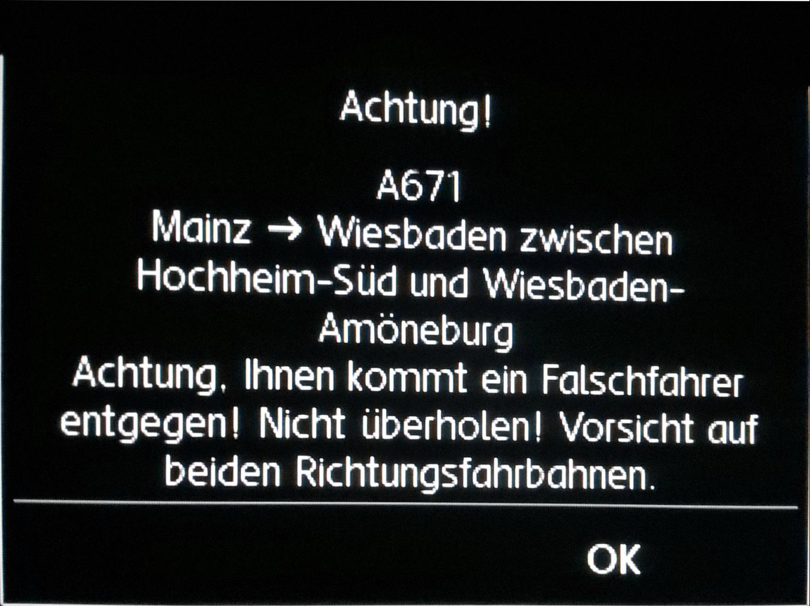 Eine Falschfahrermeldung die bei Heilbronn auftauchte und bis zur Bestätigung im Radio stehen bleibt. Auch im Golf VI hatte zumindest das RNS315 schon diese Funktion, aber nur als Ansage "Achtung Falschfahrer". Danach konnte man über die Traffic Taste nachlesen.