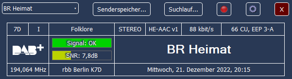 Ensemble 0x1019, Label: 'rbb Berlin K7D', ShortLabel: 'Berlin7D', LTO: +60 min, ECC: 0xE0, AlarmFlag: 0, NumServices: 14 Audio-Service 0xD314, Label: 'BR-Klassik', ShortLabel: 'BR-Klass', PTY: Serious Classical (dynamic), AnnouncementSupport: No, NumComponents: 1 (Audio: 1, Data: 0) AudioComponent, SCIdS: 0, Label: '', ShortLabel: '', ASCTy: 0x3F (AAC), SubChId: 11, StartCU: 528, NumCU: 72, ErrorProt: EEP 3-A (FEC: 1/2), Datarate: 96 kbit/s, NumUserApps: 1 User App 1 / 1, Label: '', ShortLabel: '', DSCTy: 0x3C (MOT), X-PAD type: 12, UaType: 0x2 (Slideshow), DataLen: 2 [0C3C] Audio-Service 0xD316, Label: 'BR Schlager', ShortLabel: 'BRSchlgr', PTY: Oldies Music (dynamic), AnnouncementSupport: No, NumComponents: 1 (Audio: 1, Data: 0) AudioComponent, SCIdS: 0, Label: '', ShortLabel: '', ASCTy: 0x3F (AAC), SubChId: 16, StartCU: 720, NumCU: 66, ErrorProt: EEP 3-A (FEC: 1/2), Datarate: 88 kbit/s, NumUserApps: 1 User App 1 / 1, Label: '', ShortLabel: '', DSCTy: 0x3C (MOT), X-PAD type: 12, UaType: 0x2 (Slideshow), DataLen: 2 [0C3C] Audio-Service 0xD321, Label: 'rbb 88.8', ShortLabel: 'rbb 88.8', PTY: Pop Music (dynamic), AnnouncementSupport: Yes, Flags: 0x0002 [Road Traffic flash], NumClusters: 1 [3], NumComponents: 1 (Audio: 1, Data: 0) AudioComponent, SCIdS: 0, Label: '', ShortLabel: '', ASCTy: 0x3F (AAC), SubChId: 6, StartCU: 324, NumCU: 66, ErrorProt: EEP 3-A (FEC: 1/2), Datarate: 88 kbit/s, NumUserApps: 1 User App 1 / 1, Label: '', ShortLabel: '', DSCTy: 0x3C (MOT), X-PAD type: 12, UaType: 0x2 (Slideshow), DataLen: 2 [0C3C] Audio-Service 0xD323, Label: 'rbbKultur', ShortLabel: 'Kultur', PTY: Culture (dynamic), AnnouncementSupport: No, NumComponents: 1 (Audio: 1, Data: 0) AudioComponent, SCIdS: 0, Label: '', ShortLabel: '', ASCTy: 0x3F (AAC), SubChId: 5, StartCU: 252, NumCU: 72, ErrorProt: EEP 3-A (FEC: 1/2), Datarate: 96 kbit/s, NumUserApps: 1 User App 1 / 1, Label: '', ShortLabel: '', DSCTy: 0x3C (MOT), X-PAD type: 12, UaType: 0x2 (Slideshow), DataLen: 2 [0C3C] Audio-Service 0xD332, Label: 'radio1', ShortLabel: 'radio1', PTY: Pop Music (dynamic), AnnouncementSupport: Yes, Flags: 0x0002 [Road Traffic flash], NumClusters: 1 [4], NumComponents: 1 (Audio: 1, Data: 0) AudioComponent, SCIdS: 0, Label: '', ShortLabel: '', ASCTy: 0x3F (AAC), SubChId: 1, StartCU: 60, NumCU: 66, ErrorProt: EEP 3-A (FEC: 1/2), Datarate: 88 kbit/s, NumUserApps: 1 User App 1 / 1, Label: '', ShortLabel: '', DSCTy: 0x3C (MOT), X-PAD type: 12, UaType: 0x2 (Slideshow), DataLen: 2 [0C3C] Audio-Service 0xD333, Label: 'Fritz', ShortLabel: 'Fritz', PTY: Pop Music (dynamic), AnnouncementSupport: Yes, Flags: 0x0002 [Road Traffic flash], NumClusters: 1 [5], NumComponents: 1 (Audio: 1, Data: 0) AudioComponent, SCIdS: 0, Label: '', ShortLabel: '', ASCTy: 0x3F (AAC), SubChId: 7, StartCU: 390, NumCU: 66, ErrorProt: EEP 3-A (FEC: 1/2), Datarate: 88 kbit/s, NumUserApps: 1 User App 1 / 1, Label: '', ShortLabel: '', DSCTy: 0x3C (MOT), X-PAD type: 12, UaType: 0x2 (Slideshow), DataLen: 2 [0C3C] Audio-Service 0xD335, Label: 'rbb24 Inforadio', ShortLabel: 'Info', PTY: Information (dynamic), AnnouncementSupport: Yes, Flags: 0x0002 [Road Traffic flash], NumClusters: 1 [2], NumComponents: 1 (Audio: 1, Data: 0) AudioComponent, SCIdS: 0, Label: '', ShortLabel: '', ASCTy: 0x3F (AAC), SubChId: 8, StartCU: 456, NumCU: 48, ErrorProt: EEP 3-A (FEC: 1/2), Datarate: 64 kbit/s, NumUserApps: 1 User App 1 / 1, Label: '', ShortLabel: '', DSCTy: 0x3C (MOT), X-PAD type: 12, UaType: 0x2 (Slideshow), DataLen: 2 [0C3C] Audio-Service 0xD395, Label: 'WDR 5', ShortLabel: 'WDR 5', PTY: Science (dynamic), AnnouncementSupport: No, NumComponents: 1 (Audio: 1, Data: 0) AudioComponent, SCIdS: 0, Label: '', ShortLabel: '', ASCTy: 0x3F (AAC), SubChId: 2, StartCU: 126, NumCU: 60, ErrorProt: EEP 3-A (FEC: 1/2), Datarate: 80 kbit/s, NumUserApps: 1 User App 1 / 1, Label: '', ShortLabel: '', DSCTy: 0x3C (MOT), X-PAD type: 12, UaType: 0x2 (Slideshow), DataLen: 2 [0C3C] Audio-Service 0xD3A3, Label: 'SWR3', ShortLabel: 'SWR3', PTY: Pop Music (dynamic), AnnouncementSupport: No, NumComponents: 1 (Audio: 1, Data: 0) AudioComponent, SCIdS: 0, Label: '', ShortLabel: '', ASCTy: 0x3F (AAC), SubChId: 4, StartCU: 186, NumCU: 66, ErrorProt: EEP 3-A (FEC: 1/2), Datarate: 88 kbit/s, NumUserApps: 1 User App 1 / 1, Label: '', ShortLabel: '', DSCTy: 0x3C (MOT), X-PAD type: 12, UaType: 0x2 (Slideshow), DataLen: 2 [0C3C] Audio-Service 0xD3A6, Label: 'SWR Aktuell', ShortLabel: 'SWR Aktu', PTY: Information (dynamic), AnnouncementSupport: No, NumComponents: 1 (Audio: 1, Data: 0) AudioComponent, SCIdS: 0, Label: '', ShortLabel: '', ASCTy: 0x3F (AAC), SubChId: 15, StartCU: 666, NumCU: 54, ErrorProt: EEP 3-A (FEC: 1/2), Datarate: 72 kbit/s, NumUserApps: 1 User App 1 / 1, Label: '', ShortLabel: '', DSCTy: 0x3C (MOT), X-PAD type: 12, UaType: 0x2 (Slideshow), DataLen: 2 [0C3C] Audio-Service 0xD431, Label: 'Antenne P', ShortLabel: 'Ant P', PTY: Pop Music (dynamic), AnnouncementSupport: Yes, Flags: 0x0002 [Road Traffic flash], NumClusters: 1 [1], NumComponents: 1 (Audio: 1, Data: 0) AudioComponent, SCIdS: 0, Label: '', ShortLabel: '', ASCTy: 0x3F (AAC), SubChId: 0, StartCU: 0, NumCU: 60, ErrorProt: EEP 3-A (FEC: 1/2), Datarate: 80 kbit/s, NumUserApps: 1 User App 1 / 1, Label: '', ShortLabel: '', DSCTy: 0x3C (MOT), X-PAD type: 12, UaType: 0x2 (Slideshow), DataLen: 2 [0C3C] Audio-Service 0xDF16, Label: 'BR Heimat', ShortLabel: 'BRHeimat', PTY: Folk Music (dynamic), AnnouncementSupport: No, NumComponents: 1 (Audio: 1, Data: 0) AudioComponent, SCIdS: 0, Label: '', ShortLabel: '', ASCTy: 0x3F (AAC), SubChId: 12, StartCU: 600, NumCU: 66, ErrorProt: EEP 3-A (FEC: 1/2), Datarate: 88 kbit/s, NumUserApps: 1 User App 1 / 1, Label: '', ShortLabel: '', DSCTy: 0x3C (MOT), X-PAD type: 12, UaType: 0x2 (Slideshow), DataLen: 2 [0C3C] Data-Service 0xE0D01019, Label: 'rbb EPG', ShortLabel: 'EPG', PTY: -, AnnouncementSupport: No, NumComponents: 1 (Audio: 0, Data: 1) DataComponent (MSC packet data), SCIdS: 0, SCId: 0, Label: '', S