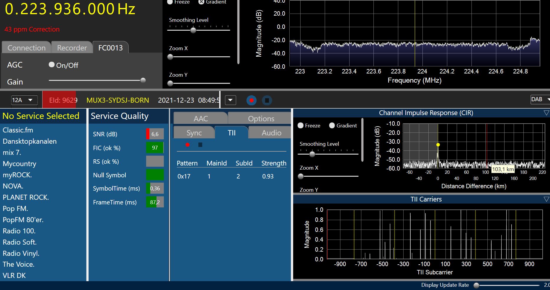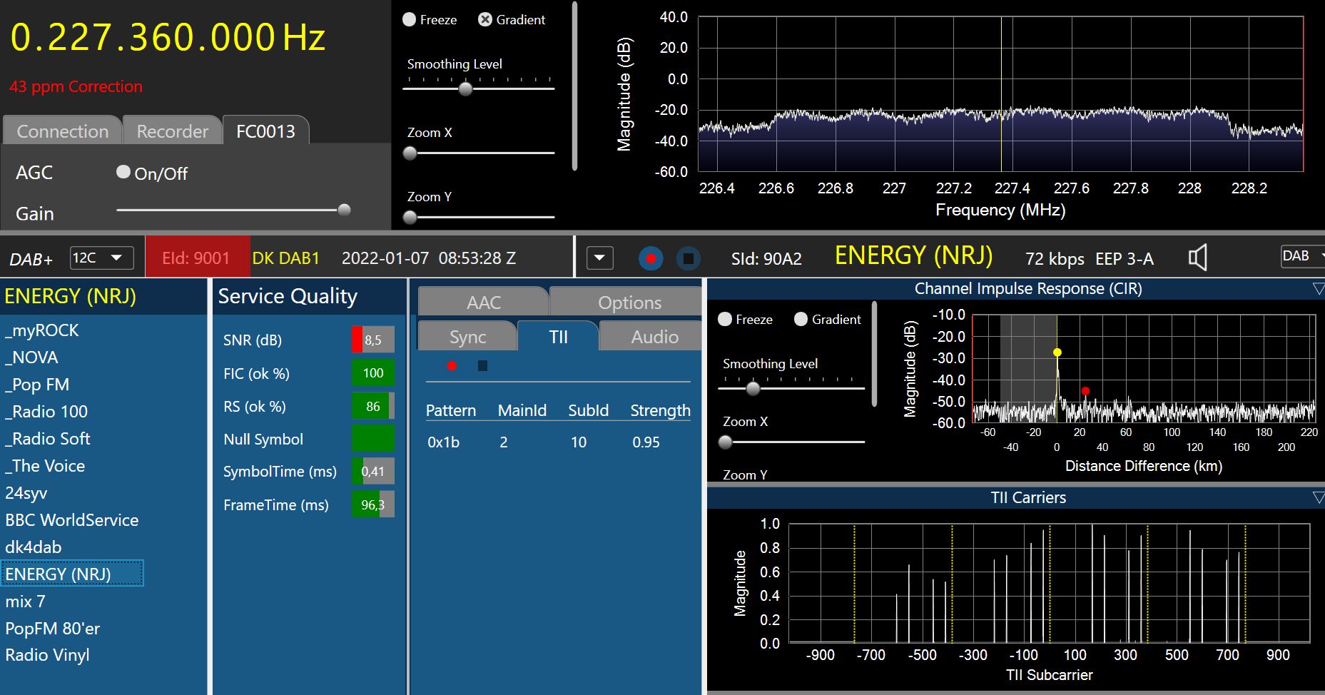 Ensemble 0x9001, Label: 'DK DAB1', ShortLabel: 'DK DAB1', LTO: +60 min, ECC: 0xE1, NumServices: 13
