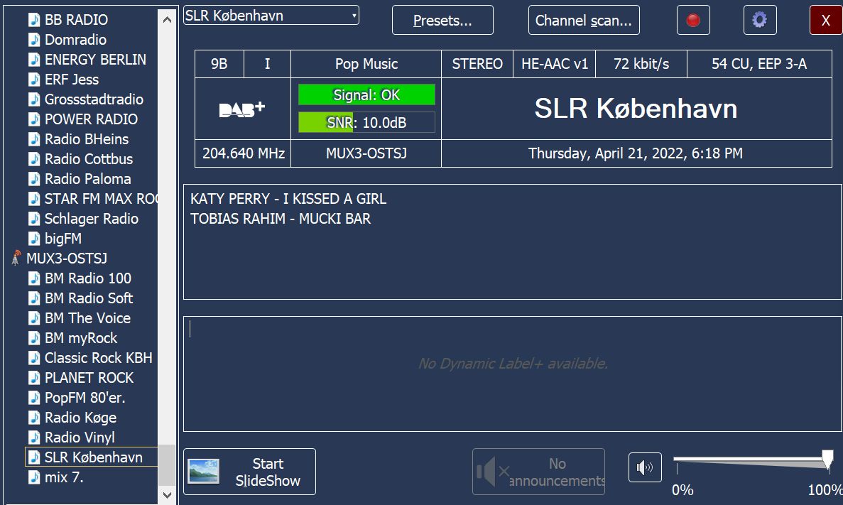 Ensemble 0x9102, Label: 'MUX3-OSTSJ', ShortLabel: 'MUX3-OST', LTO: +120 min, ECC: 0xE1, NumServices: 11 Audio-Service 0x9199, Label: 'PopFM 80'er.', ShortLabel: 'PopFM 80', PTY: Pop Music (dynamic), AnnouncementSupport: No, NumComponents: 1 (Audio: 1, Data: 0) AudioComponent, SCIdS: 0, Label: '', ShortLabel: '', ASCTy: 0x3F (AAC), SubChId: 3, StartCU: 540, NumCU: 72, ErrorProt: EEP 3-A (FEC: 1/2), Datarate: 96 kbit/s, NumUserApps: 1 User App 1 / 1, Label: '', ShortLabel: '', DSCTy: 0x3C (MOT), X-PAD type: 12, UaType: 0x2 (Slideshow), DataLen: 2 [0C3C] Audio-Service 0x9619, Label: 'BM The Voice', ShortLabel: 'BM Voice', PTY: Pop Music (dynamic), AnnouncementSupport: No, NumComponents: 1 (Audio: 1, Data: 0) AudioComponent, SCIdS: 0, Label: '', ShortLabel: '', ASCTy: 0x3F (AAC), SubChId: 5, StartCU: 126, NumCU: 72, ErrorProt: EEP 3-A (FEC: 1/2), Datarate: 96 kbit/s, NumUserApps: 1 User App 1 / 1, Label: '', ShortLabel: '', DSCTy: 0x3C (MOT), X-PAD type: 12, UaType: 0x2 (Slideshow), DataLen: 2 [0C3C] Audio-Service 0x9624, Label: 'BM myRock', ShortLabel: 'BM myR', PTY: Rock Music (dynamic), AnnouncementSupport: No, NumComponents: 1 (Audio: 1, Data: 0) AudioComponent, SCIdS: 0, Label: '', ShortLabel: '', ASCTy: 0x3F (AAC), SubChId: 4, StartCU: 54, NumCU: 72, ErrorProt: EEP 3-A (FEC: 1/2), Datarate: 96 kbit/s, NumUserApps: 1 User App 1 / 1, Label: '', ShortLabel: '', DSCTy: 0x3C (MOT), X-PAD type: 12, UaType: 0x2 (Slideshow), DataLen: 2 [0C3C] Audio-Service 0x96EA, Label: 'PLANET ROCK', ShortLabel: 'PL ROCK', PTY: Rock Music (dynamic), AnnouncementSupport: No, NumComponents: 1 (Audio: 1, Data: 0) AudioComponent, SCIdS: 0, Label: '', ShortLabel: '', ASCTy: 0x3F (AAC), SubChId: 9, StartCU: 612, NumCU: 72, ErrorProt: EEP 3-A (FEC: 1/2), Datarate: 96 kbit/s, NumUserApps: 1 User App 1 / 1, Label: '', ShortLabel: '', DSCTy: 0x3C (MOT), X-PAD type: 12, UaType: 0x2 (Slideshow), DataLen: 2 [0C3C] Audio-Service 0x9729, Label: 'Radio Vinyl', ShortLabel: ' Vinyl', PTY: Oldies Music (dynamic), AnnouncementSupport: No, NumComponents: 1 (Audio: 1, Data: 0) AudioComponent, SCIdS: 0, Label: '', ShortLabel: '', ASCTy: 0x3F (AAC), SubChId: 2, StartCU: 396, NumCU: 72, ErrorProt: EEP 3-A (FEC: 1/2), Datarate: 96 kbit/s, NumUserApps: 1 User App 1 / 1, Label: '', ShortLabel: '', DSCTy: 0x3C (MOT), X-PAD type: 12, UaType: 0x2 (Slideshow), DataLen: 2 [0C3C] Audio-Service 0x973F, Label: 'BM Radio 100', ShortLabel: 'BM R100', PTY: Pop Music (dynamic), AnnouncementSupport: No, NumComponents: 1 (Audio: 1, Data: 0) AudioComponent, SCIdS: 0, Label: '', ShortLabel: '', ASCTy: 0x3F (AAC), SubChId: 6, StartCU: 198, NumCU: 72, ErrorProt: EEP 3-A (FEC: 1/2), Datarate: 96 kbit/s, NumUserApps: 1 User App 1 / 1, Label: '', ShortLabel: '', DSCTy: 0x3C (MOT), X-PAD type: 12, UaType: 0x2 (Slideshow), DataLen: 2 [0C3C] Audio-Service 0x97A2, Label: 'BM Radio Soft', ShortLabel: 'BM RSoft', PTY: Pop Music (dynamic), AnnouncementSupport: No, NumComponents: 1 (Audio: 1, Data: 0) AudioComponent, SCIdS: 0, Label: '', ShortLabel: '', ASCTy: 0x3F (AAC), SubChId: 7, StartCU: 270, NumCU: 72, ErrorProt: EEP 3-A (FEC: 1/2), Datarate: 96 kbit/s, NumUserApps: 1 User App 1 / 1, Label: '', ShortLabel: '', DSCTy: 0x3C (MOT), X-PAD type: 12, UaType: 0x2 (Slideshow), DataLen: 2 [0C3C] Audio-Service 0x984C, Label: 'Radio Køge', ShortLabel: 'R Køge', PTY: Pop Music (dynamic), AnnouncementSupport: No, NumComponents: 1 (Audio: 1, Data: 0) AudioComponent, SCIdS: 0, Label: '', ShortLabel: '', ASCTy: 0x3F (AAC), SubChId: 1, StartCU: 0, NumCU: 54, ErrorProt: EEP 3-A (FEC: 1/2), Datarate: 72 kbit/s, NumUserApps: 1 User App 1 / 1, Label: '', ShortLabel: '', DSCTy: 0x3C (MOT), X-PAD type: 12, UaType: 0x2 (Slideshow), DataLen: 2 [0C3C] Audio-Service 0x9A53, Label: 'SLR København', ShortLabel: 'SLR Kbh', PTY: Pop Music (dynamic), AnnouncementSupport: No, NumComponents: 1 (Audio: 1, Data: 0) AudioComponent, SCIdS: 0, Label: '', ShortLabel: '', ASCTy: 0x3F (AAC), SubChId: 10, StartCU: 684, NumCU: 54, ErrorProt: EEP 3-A (FEC: 1/2), Datarate: 72 kbit/s, NumUserApps: 1 User App 1 / 1, Label: '', ShortLabel: '', DSCTy: 0x3C (MOT), X-PAD type: 12, UaType: 0x2 (Slideshow), DataLen: 2 [0C3C] Audio-Service 0x9E24, Label: 'mix 7.', ShortLabel: 'mix 7.', PTY: Pop Music (dynamic), AnnouncementSupport: No, NumComponents: 1 (Audio: 1, Data: 0) AudioComponent, SCIdS: 0, Label: '', ShortLabel: '', ASCTy: 0x3F (AAC), SubChId: 0, StartCU: 468, NumCU: 72, ErrorProt: EEP 3-A (FEC: 1/2), Datarate: 96 kbit/s, NumUserApps: 1 User App 1 / 1, Label: '', ShortLabel: '', DSCTy: 0x3C (MOT), X-PAD type: 12, UaType: 0x2 (Slideshow), DataLen: 2 [0C3C] Audio-Service 0x9EB1, Label: 'Classic Rock KBH', ShortLabel: 'Cla Rock', PTY: Rock Music (dynamic), AnnouncementSupport: No, NumComponents: 1 (Audio: 1, Data: 0) AudioComponent, SCIdS: 0, Label: '', ShortLabel: '', ASCTy: 0x3F (AAC), SubChId: 8, StartCU: 342, NumCU: 54, ErrorProt: EEP 3-A (FEC: 1/2), Datarate: 72 kbit/s, NumUserApps: 1 User App 1 / 1, Label: '', ShortLabel: '', DSCTy: 0x3C (MOT), X-PAD type: 12, UaType: 0x2 (Slideshow), DataLen: 2 [0C3C]