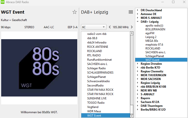 0xD123 DAB+ Leipzig [ DABLpz ] ECC: 0xE0, UTC 120 min, INT: 1, alarm announcements: 0