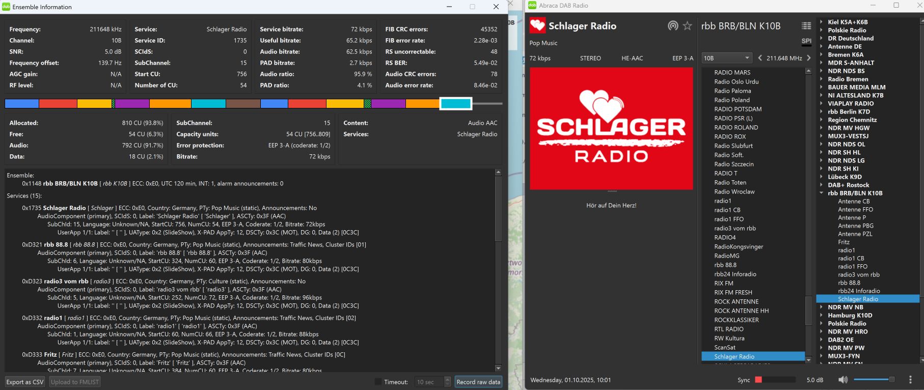 Ensemble 0x1148, Label: 'rbb BRB/BLN K10B', ShortLabel: 'rbb K10B', LTO: +120 min, ECC: 0xE0, AlarmFlag: 0, NumServices: 14 Audio-Service 0xD321, Label: 'rbb 88.8', ShortLabel: 'rbb 88.8', PTY: Pop Music (dynamic), AnnouncementSupport: Yes, Flags: 0x0002 [Road Traffic flash], NumClusters: 1 [1], NumComponents: 1 (Audio: 1, Data: 0) AudioComponent, SCIdS: 0, Label: '', ShortLabel: '', ASCTy: 0x3F (AAC), SubChId: 6, StartCU: 324, NumCU: 60, ErrorProt: EEP 3-A (FEC: 1/2), Datarate: 80 kbit/s, NumUserApps: 1 User App 1 / 1, Label: '', ShortLabel: '', DSCTy: 0x3C (MOT), X-PAD type: 12, UaType: 0x2 (Slideshow), DataLen: 2 [0C3C] Audio-Service 0xD323, Label: 'radio3 vom rbb', ShortLabel: 'radio3', PTY: Culture (dynamic), AnnouncementSupport: No, NumComponents: 1 (Audio: 1, Data: 0) AudioComponent, SCIdS: 0, Label: '', ShortLabel: '', ASCTy: 0x3F (AAC), SubChId: 5, StartCU: 252, NumCU: 72, ErrorProt: EEP 3-A (FEC: 1/2), Datarate: 96 kbit/s, NumUserApps: 1 User App 1 / 1, Label: '', ShortLabel: '', DSCTy: 0x3C (MOT), X-PAD type: 12, UaType: 0x2 (Slideshow), DataLen: 2 [0C3C] Audio-Service 0xD332, Label: 'radio1', ShortLabel: 'radio1', PTY: Pop Music (dynamic), AnnouncementSupport: Yes, Flags: 0x0002 [Road Traffic flash], NumClusters: 1 [2], NumComponents: 1 (Audio: 1, Data: 0) AudioComponent, SCIdS: 0, Label: '', ShortLabel: '', ASCTy: 0x3F (AAC), SubChId: 1, StartCU: 60, NumCU: 66, ErrorProt: EEP 3-A (FEC: 1/2), Datarate: 88 kbit/s, NumUserApps: 1 User App 1 / 1, Label: '', ShortLabel: '', DSCTy: 0x3C (MOT), X-PAD type: 12, UaType: 0x2 (Slideshow), DataLen: 2 [0C3C] Audio-Service 0xD333, Label: 'Fritz', ShortLabel: 'Fritz', PTY: Pop Music (dynamic), AnnouncementSupport: Yes, Flags: 0x0002 [Road Traffic flash], NumClusters: 1 [12], NumComponents: 1 (Audio: 1, Data: 0) AudioComponent, SCIdS: 0, Label: '', ShortLabel: '', ASCTy: 0x3F (AAC), SubChId: 7, StartCU: 384, NumCU: 60, ErrorProt: EEP 3-A (FEC: 1/2), Datarate: 80 kbit/s, NumUserApps: 1 User App 1 / 1, Label: '', ShortLabel: '', DSCTy: 0x3C (MOT), X-PAD type: 12, UaType: 0x2 (Slideshow), DataLen: 2 [0C3C] Audio-Service 0xD335, Label: 'rbb24 Inforadio', ShortLabel: 'Info', PTY: Information (dynamic), AnnouncementSupport: Yes, Flags: 0x0002 [Road Traffic flash], NumClusters: 1 [4], NumComponents: 1 (Audio: 1, Data: 0) AudioComponent, SCIdS: 0, Label: '', ShortLabel: '', ASCTy: 0x3F (AAC), SubChId: 8, StartCU: 444, NumCU: 48, ErrorProt: EEP 3-A (FEC: 1/2), Datarate: 64 kbit/s, NumUserApps: 1 User App 1 / 1, Label: '', ShortLabel: '', DSCTy: 0x3C (MOT), X-PAD type: 12, UaType: 0x2 (Slideshow), DataLen: 2 [0C3C] Audio-Service 0xD431, Label: 'Antenne P', ShortLabel: 'Ant P', PTY: Pop Music (dynamic), AnnouncementSupport: Yes, Flags: 0x0002 [Road Traffic flash], NumClusters: 1 [3], NumComponents: 1 (Audio: 1, Data: 0) AudioComponent, SCIdS: 0, Label: '', ShortLabel: '', ASCTy: 0x3F (AAC), SubChId: 0, StartCU: 0, NumCU: 60, ErrorProt: EEP 3-A (FEC: 1/2), Datarate: 80 kbit/s, NumUserApps: 1 User App 1 / 1, Label: '', ShortLabel: '', DSCTy: 0x3C (MOT), X-PAD type: 12, UaType: 0x2 (Slideshow), DataLen: 2 [0C3C] Audio-Service 0xD531, Label: 'Antenne CB', ShortLabel: 'Ant CB', PTY: Pop Music (dynamic), AnnouncementSupport: Yes, Flags: 0x0002 [Road Traffic flash], NumClusters: 1 [10], NumComponents: 1 (Audio: 1, Data: 0) AudioComponent, SCIdS: 0, Label: '', ShortLabel: '', ASCTy: 0x3F (AAC), SubChId: 4, StartCU: 192, NumCU: 60, ErrorProt: EEP 3-A (FEC: 1/2), Datarate: 80 kbit/s, NumUserApps: 1 User App 1 / 1, Label: '', ShortLabel: '', DSCTy: 0x3C (MOT), X-PAD type: 12, UaType: 0x2 (Slideshow), DataLen: 2 [0C3C] Audio-Service 0xD532, Label: 'radio1 CB', ShortLabel: 'radio1CB', PTY: Pop Music (dynamic), AnnouncementSupport: Yes, Flags: 0x0002 [Road Traffic flash], NumClusters: 1 [13], NumComponents: 1 (Audio: 1, Data: 0) AudioComponent, SCIdS: 0, Label: '', ShortLabel: '', ASCTy: 0x3F (AAC), SubChId: 9, StartCU: 492, NumCU: 66, ErrorProt: EEP 3-A (FEC: 1/2), Datarate: 88 kbit/s, NumUserApps: 1 User App 1 / 1, Label: '', ShortLabel: '', DSCTy: 0x3C (MOT), X-PAD type: 12, UaType: 0x2 (Slideshow), DataLen: 2 [0C3C] Audio-Service 0xD631, Label: 'Antenne FFO', ShortLabel: 'Ant FFO', PTY: Pop Music (dynamic), AnnouncementSupport: Yes, Flags: 0x0002 [Road Traffic flash], NumClusters: 1 [9], NumComponents: 1 (Audio: 1, Data: 0) AudioComponent, SCIdS: 0, Label: '', ShortLabel: '', ASCTy: 0x3F (AAC), SubChId: 2, StartCU: 126, NumCU: 60, ErrorProt: EEP 3-A (FEC: 1/2), Datarate: 80 kbit/s, NumUserApps: 1 User App 1 / 1, Label: '', ShortLabel: '', DSCTy: 0x3C (MOT), X-PAD type: 12, UaType: 0x2 (Slideshow), DataLen: 2 [0C3C] Audio-Service 0xD632, Label: 'radio1 FFO', ShortLabel: 'radio1FO', PTY: Pop Music (dynamic), AnnouncementSupport: Yes, Flags: 0x0002 [Road Traffic flash], NumClusters: 1 [14], NumComponents: 1 (Audio: 1, Data: 0) AudioComponent, SCIdS: 0, Label: '', ShortLabel: '', ASCTy: 0x3F (AAC), SubChId: 10, StartCU: 558, NumCU: 66, ErrorProt: EEP 3-A (FEC: 1/2), Datarate: 88 kbit/s, NumUserApps: 1 User App 1 / 1, Label: '', ShortLabel: '', DSCTy: 0x3C (MOT), X-PAD type: 12, UaType: 0x2 (Slideshow), DataLen: 2 [0C3C] Audio-Service 0xD731, Label: 'Antenne PZL', ShortLabel: 'Ant PZL', PTY: Pop Music (dynamic), AnnouncementSupport: Yes, Flags: 0x0002 [Road Traffic flash], NumClusters: 1 [11], NumComponents: 1 (Audio: 1, Data: 0) AudioComponent, SCIdS: 0, Label: '', ShortLabel: '', ASCTy: 0x3F (AAC), SubChId: 14, StartCU: 696, NumCU: 60, ErrorProt: EEP 3-A (FEC: 1/2), Datarate: 80 kbit/s, NumUserApps: 1 User App 1 / 1, Label: '', ShortLabel: '', DSCTy: 0x3C (MOT), X-PAD type: 12, UaType: 0x2 (Slideshow), DataLen: 2 [0C3C] Audio-Service 0xD831, Label: 'Antenne PBG', ShortLabel: 'Ant PBG', PTY: Pop Music (dynamic), AnnouncementSupport: Yes, Flags: 0x0002 [Road Traffic flash], NumClusters: 1 [7], NumComponents: 1 (Audio: 1, Data: 0) AudioComponent, SCIdS: 0, Label: '', ShortLabel: '', ASCTy: 0x3F (AAC), SubChId: 12, StartCU: 636, NumCU: 60, ErrorProt: EEP 3-A (FEC: 1/2